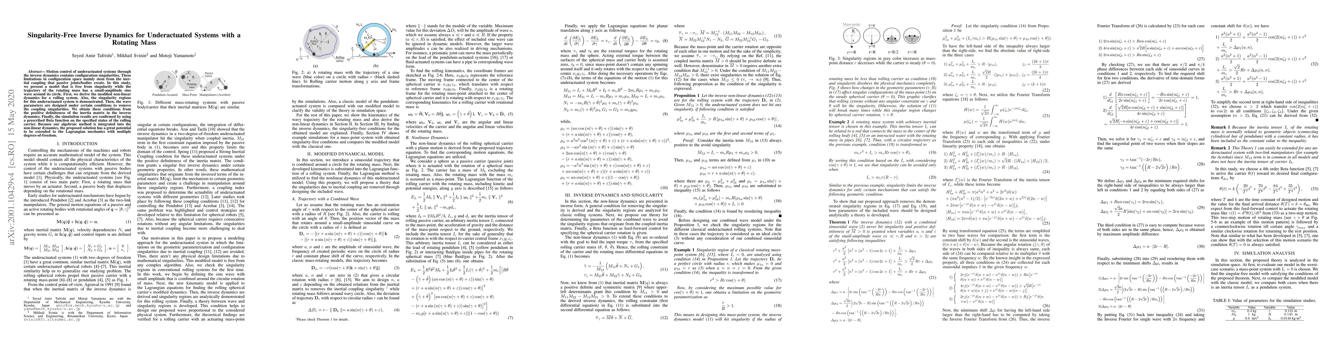 This paper proposes a singularity-free inverse dynamics model for underactuated systems with a rotating mass, addressing configuration singularities caused by inertial coupling. The authors derive modified non-linear dynamics and demonstrate how wave parameters can be designed to eliminate these singularities, validated through simulations using a Beta function.