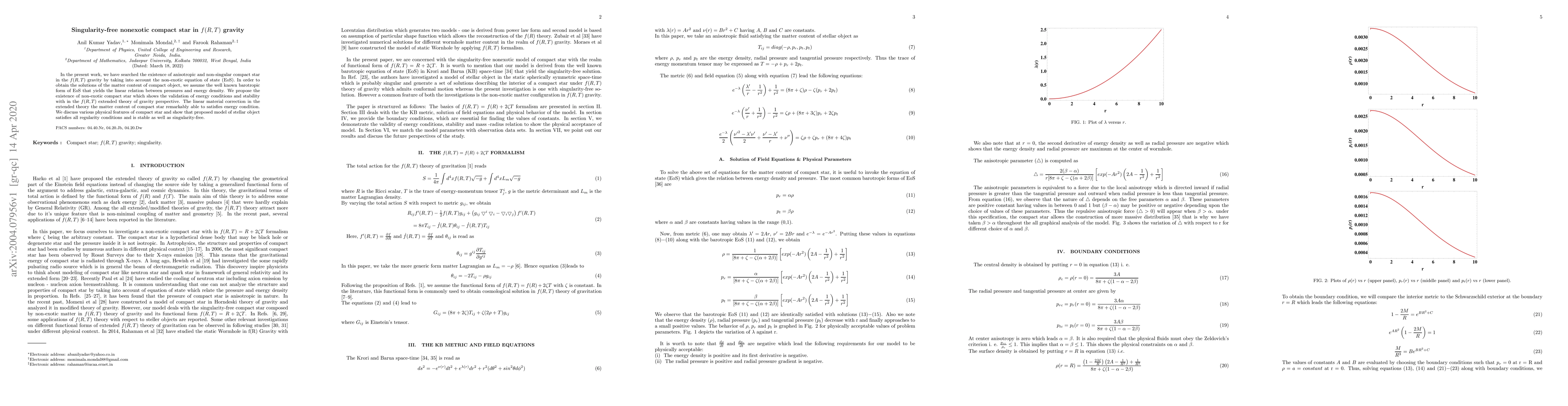 The research explores the existence of anisotropic and non-singular compact stars in $f(R,T)$ gravity using a non-exotic equation of state (EoS). The barotropic form of EoS is assumed, yielding a linear relation between pressures and energy density. The matter content of the compact star is analyzed for validation within the extended theory of gravity, satisfying energy conditions and stability.