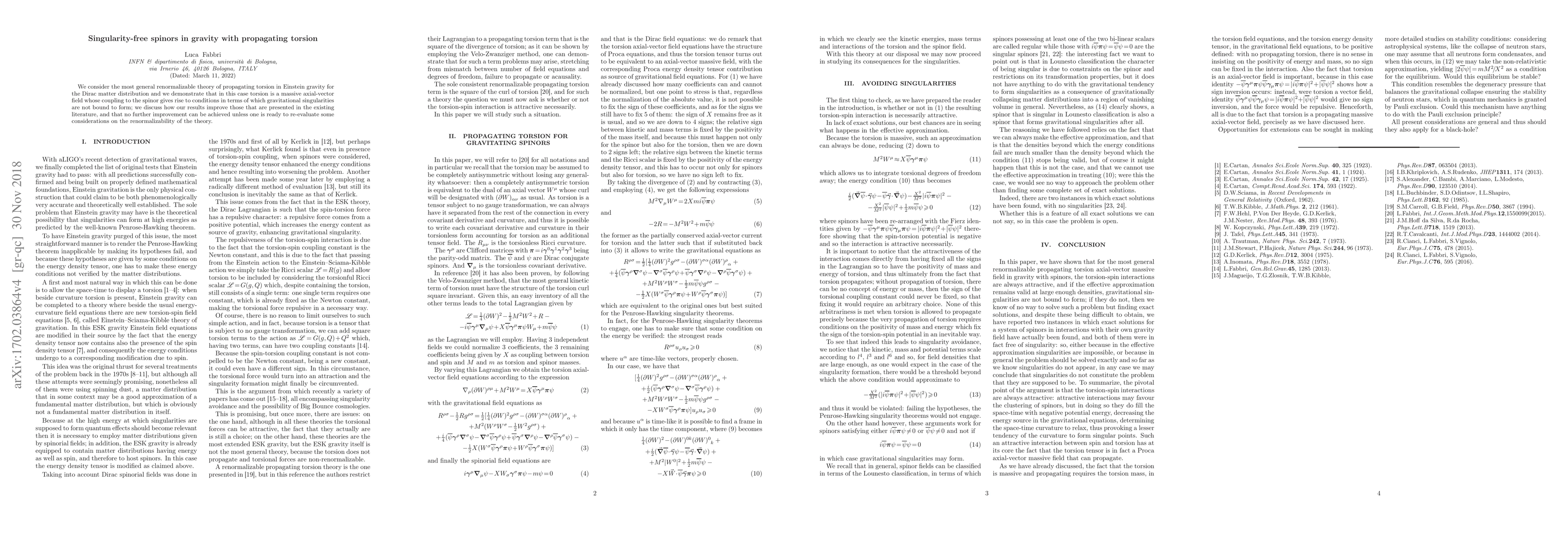 We consider the most general renormalizable theory of propagating torsion in Einstein gravity for the Dirac matter distribution and we demonstrate that in this case torsion is a massive axial-vector field whose coupling to the spinor gives rise to conditions in terms of which gravitational singularities are not bound to form; we discuss how our results improve those that are presented in the existing literature, and that no further improvement can be achieved unless one is ready to re-evaluate some considerations on the renormalizability of the theory.