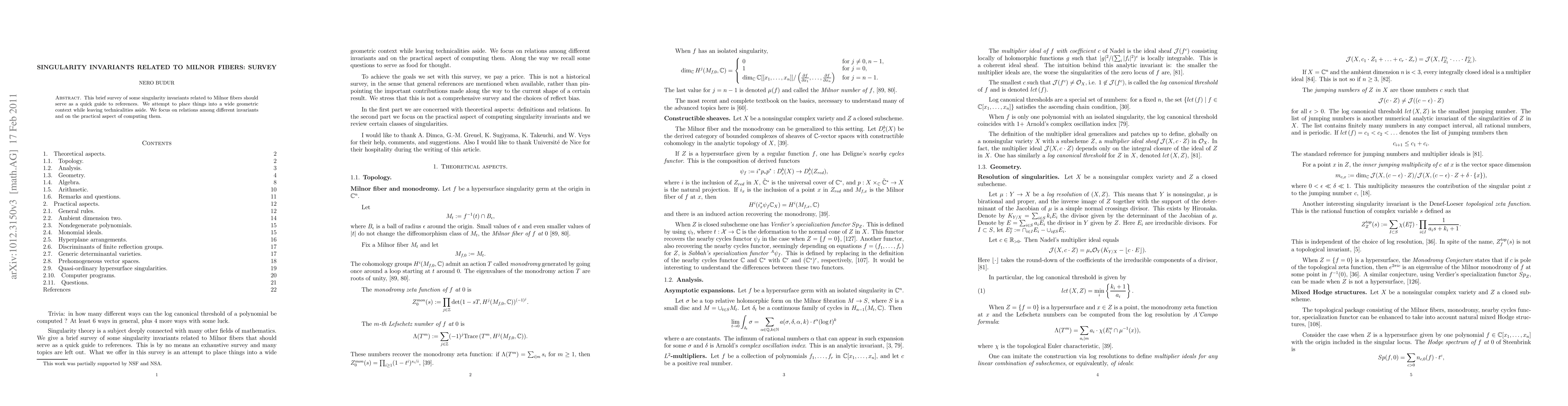 This brief survey of some singularity invariants related to Milnor fibers should serve as a quick guide to references. We attempt to place things into a wide geometric context while leaving technicalities aside. We focus on relations among different invariants and on the practical aspect of computing them.