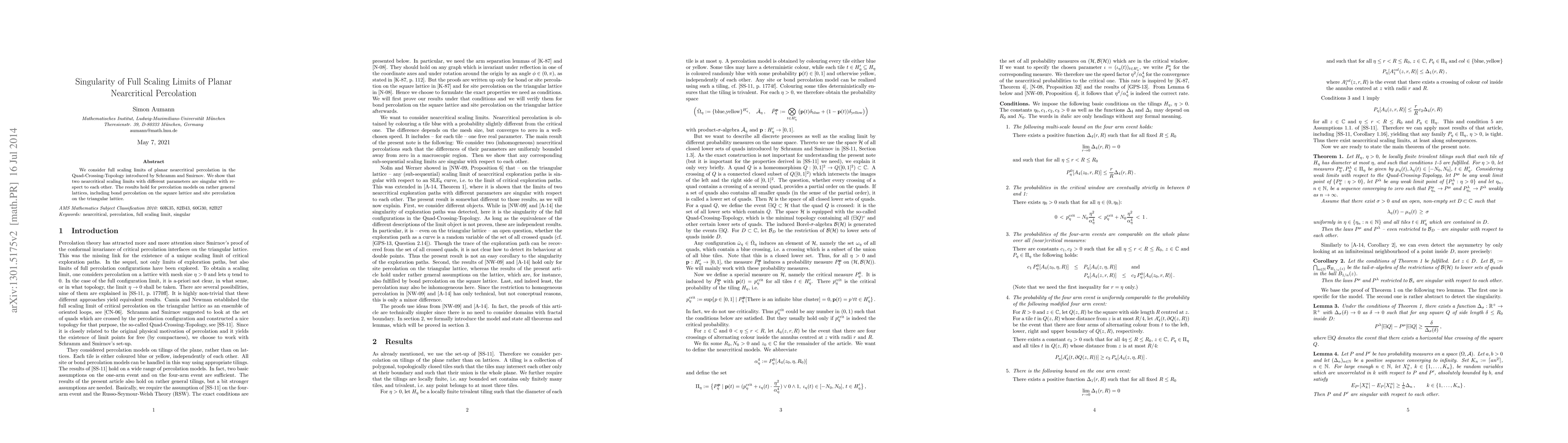 This paper investigates the full scaling limits of planar nearcritical percolation in the Quad-Crossing-Topology, demonstrating that two distinct nearcritical scaling limits are singular with respect to each other. The findings apply to various percolation models across general lattices, such as bond percolation on the square lattice and site percolation on the triangular lattice.
