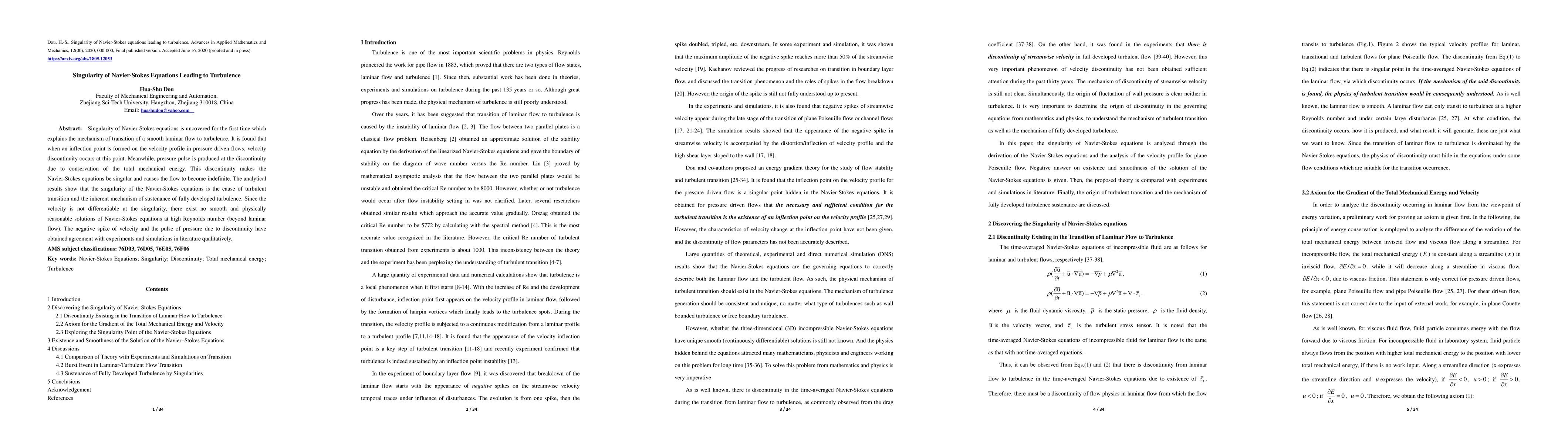 This paper reveals the singularity in Navier-Stokes equations that explains the transition from laminar to turbulent flow, attributing the turbulence to velocity discontinuities at inflection points. The study finds that these discontinuities cause a pressure pulse, leading to the equations' singularity and the onset of turbulence.