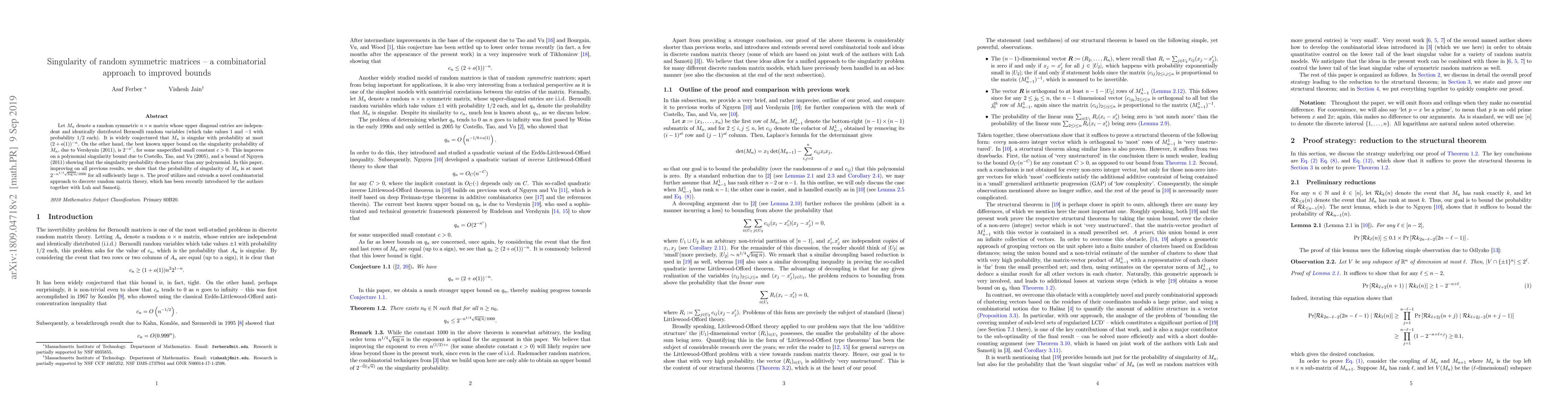 Let $M_n$ denote a random symmetric $n \times n$ matrix whose upper diagonal entries are independent and identically distributed Bernoulli random variables (which take values $1$ and $-1$ with probability $1/2$ each). It is widely conjectured that $M_n$ is singular with probability at most $(2+o(1))^{-n}$. On the other hand, the best known upper bound on the singularity probability of $M_n$, due to Vershynin (2011), is $2^{-n^c}$, for some unspecified small constant $c > 0$. This improves on a polynomial singularity bound due to Costello, Tao, and Vu (2005), and a bound of Nguyen (2011) showing that the singularity probability decays faster than any polynomial. In this paper, improving on all previous results, we show that the probability of singularity of $M_n$ is at most $2^{-n^{1/4}\sqrt{\log{n}}/1000}$ for all sufficiently large $n$. The proof utilizes and extends a novel combinatorial approach to discrete random matrix theory, which has been recently introduced by the authors together with Luh and Samotij.