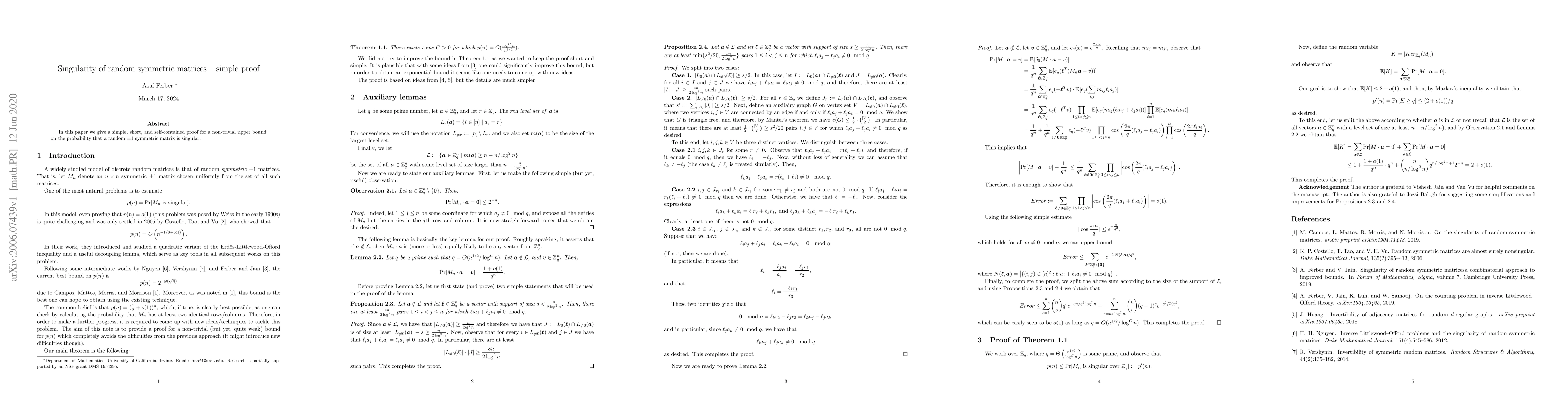 This paper offers a straightforward proof showing that a random symmetric matrix, with entries as u22151 or u2215-1, is unlikely to be singular, providing an essential upper bound on this probability.