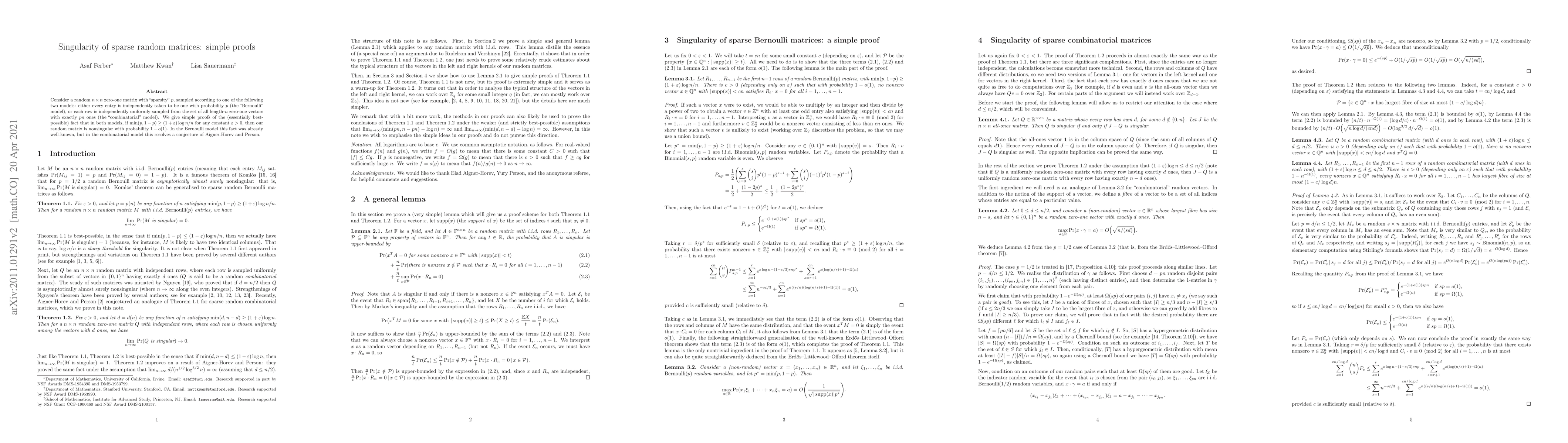 Consider a random $n\times n$ zero-one matrix with "density" $p$, sampled according to one of the following two models: either every entry is independently taken to be one with probability $p$ (the "Bernoulli" model), or each row is independently uniformly sampled from the set of all length-$n$ zero-one vectors with exactly $pn$ ones (the "combinatorial" model). We give simple proofs of the (essentially best-possible) fact that in both models, if $\min(p,1-p)\geq (1+\varepsilon)\log n/n$ for any constant $\varepsilon>0$, then our random matrix is nonsingular with probability $1-o(1)$. In the Bernoulli model this fact was already well-known, but in the combinatorial model this resolves a conjecture of Aigner-Horev and Person.