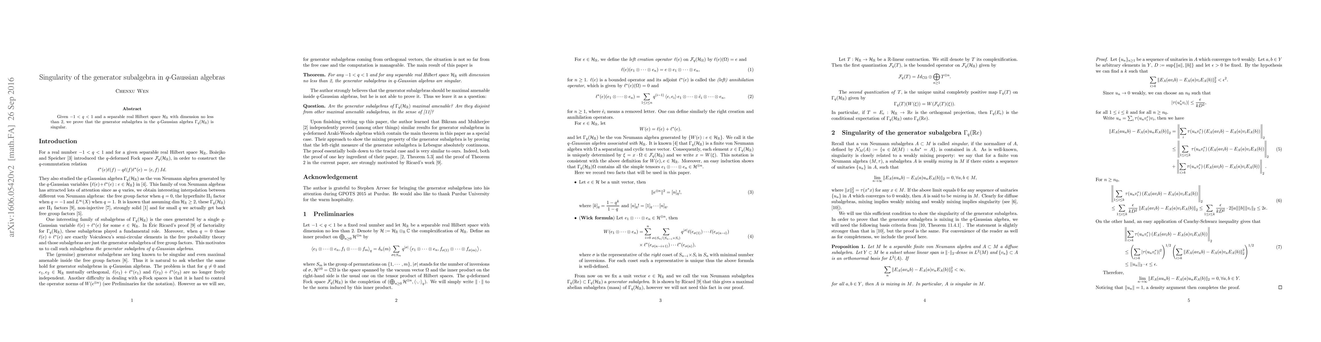 Given $-1 < q < 1$ and a separable real Hilbert space with dimension no less than 2, we prove that the generator subalgebra in the $q$-Gaussian algebra is singular.