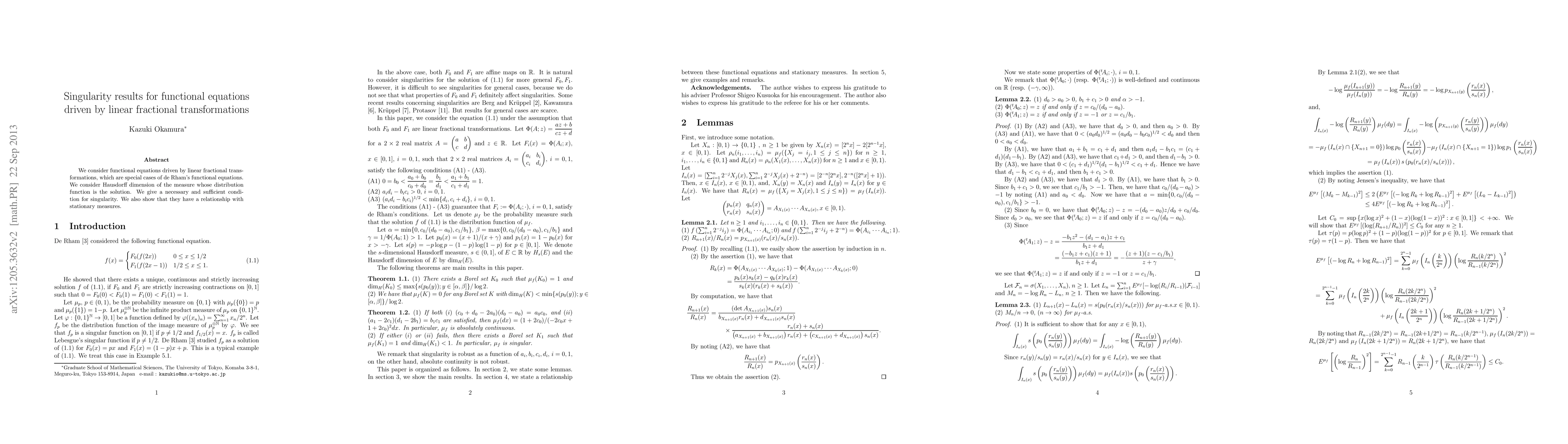 We consider functional equations driven by linear fractional transformations, which are special cases of de Rham's functional equations. We consider Hausdorff dimension of the measure whose distribution function is the solution. We give a necessary and sufficient condition for singularity. We also show that they have a relationship with stationary measures.