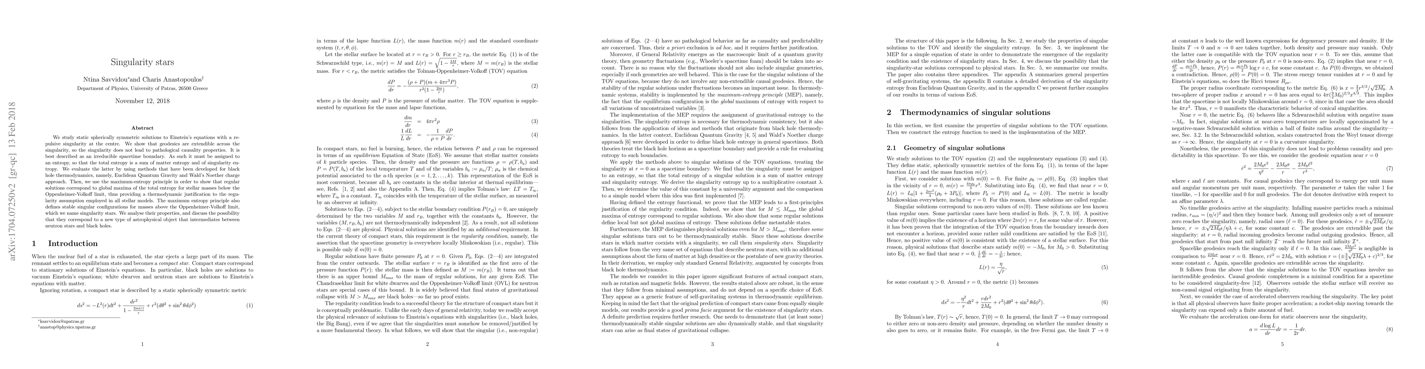Researchers study singularities in stars, finding that they don't lead to causality issues and can be used to calculate entropy, leading to a thermodynamic justification for regular stellar models. They also discover a new type of object, singularity stars, which could represent an intermediate phase between neutron stars and black holes.