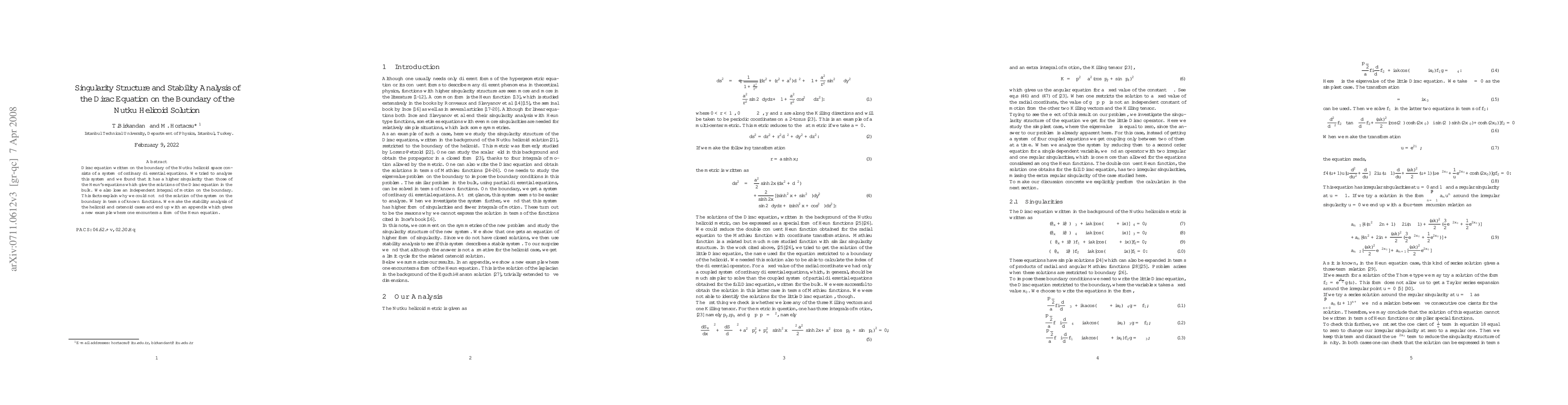 Dirac equation written on the boundary of the Nutku helicoid space consists of a system of ordinary differential equations. We tried to analyze this system and we found that it has a higher singularity than those of the Heun's equations which give the solutions of the Dirac equation in the bulk. We also lose an independent integral of motion on the boundary. This facts explain why we could not find the solution of the system on the boundary in terms of known functions. We make the stability analysis of the helicoid and catenoid cases and end up with an appendix which gives a new example where one encounters a form of the Heun equation.