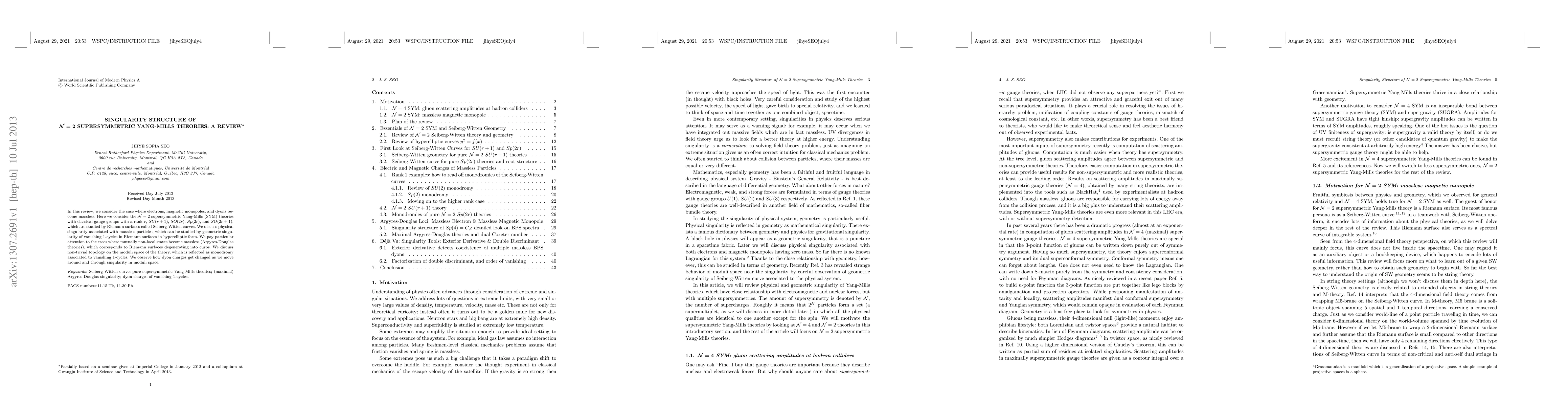 This review examines the singularity structure in ${\cal N} = 2$ supersymmetric Yang-Mills theories, focusing on massless electrons, monopoles, and dyons. It analyzes the geometric singularities of vanishing 1-cycles in Riemann surfaces, particularly in the context of Argyres-Douglas theories, and discusses the topological changes in moduli space.