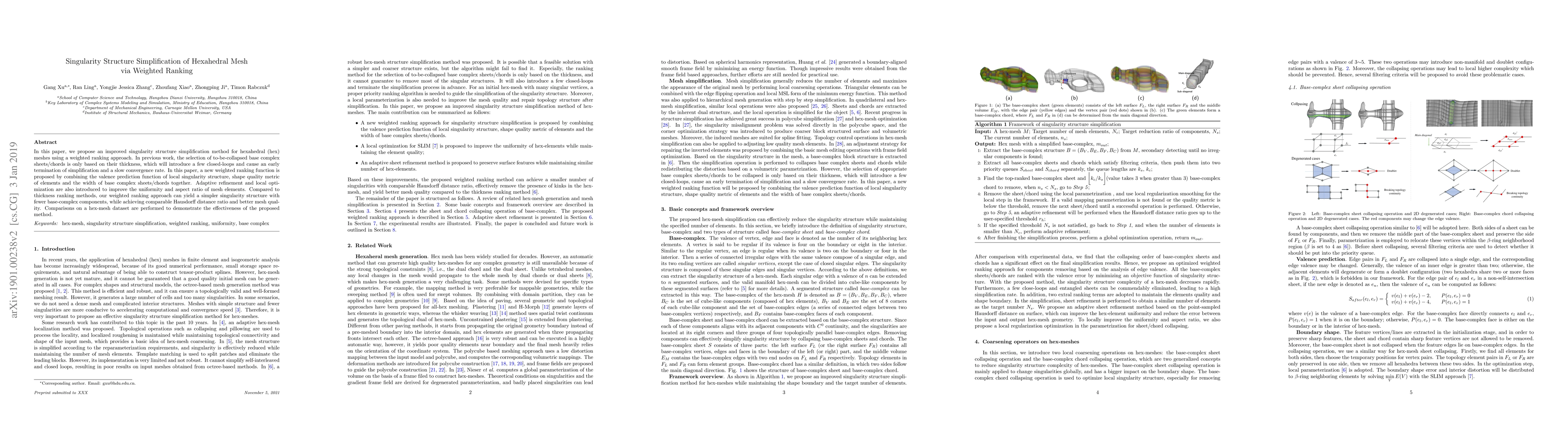 This paper proposes a weighted ranking method for simplifying singularity structures in hexahedral meshes, enhancing previous thickness-based selection by incorporating valence prediction, shape quality metrics, and sheet/chord width. The new approach achieves simpler structures with fewer components, better mesh quality, and improved convergence compared to traditional methods.