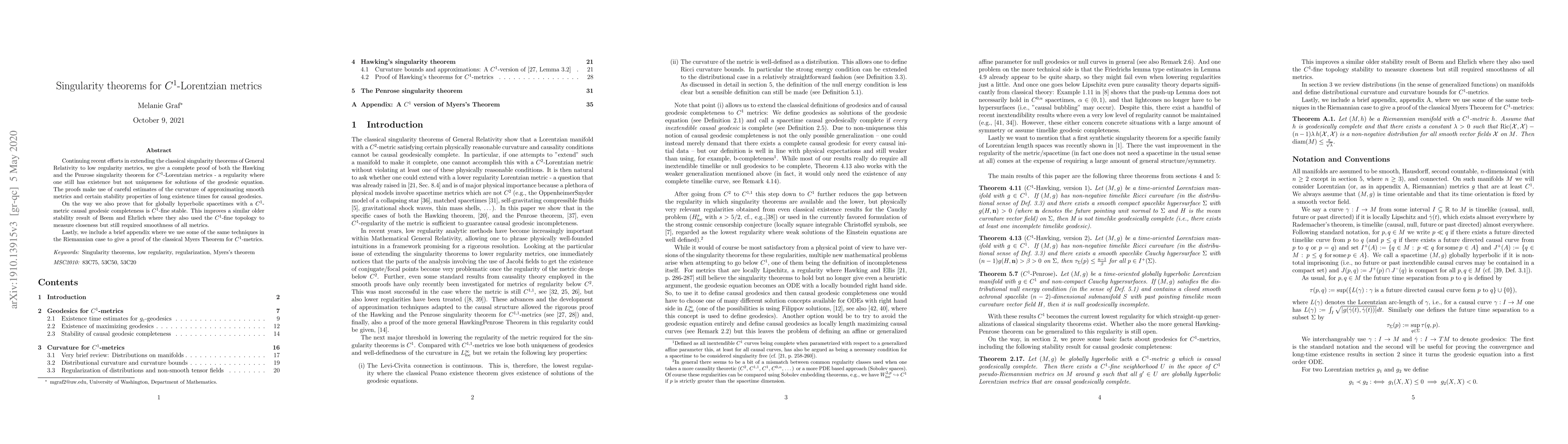 Continuing recent efforts in extending the classical singularity theorems of General Relativity to low regularity metrics, we give a complete proof of both the Hawking and the Penrose singularity theorem for $C^1$-Lorentzian metrics - a regularity where one still has existence but not uniqueness for solutions of the geodesic equation. The proofs make use of careful estimates of the curvature of approximating smooth metrics and certain stability properties of long existence times for causal geodesics. On the way we also prove that for globally hyperbolic spacetimes with a $C^1$-metric causal geodesic completeness is $C^1$-fine stable. This improves a similar older stability result of Beem and Ehrlich where they also used the $C^1$-fine topology to measure closeness but still required smoothness of all metrics. Lastly, we include a brief appendix where we use some of the same techniques in the Riemannian case to give a proof of the classical Myers Theorem for $C^1$-metrics.