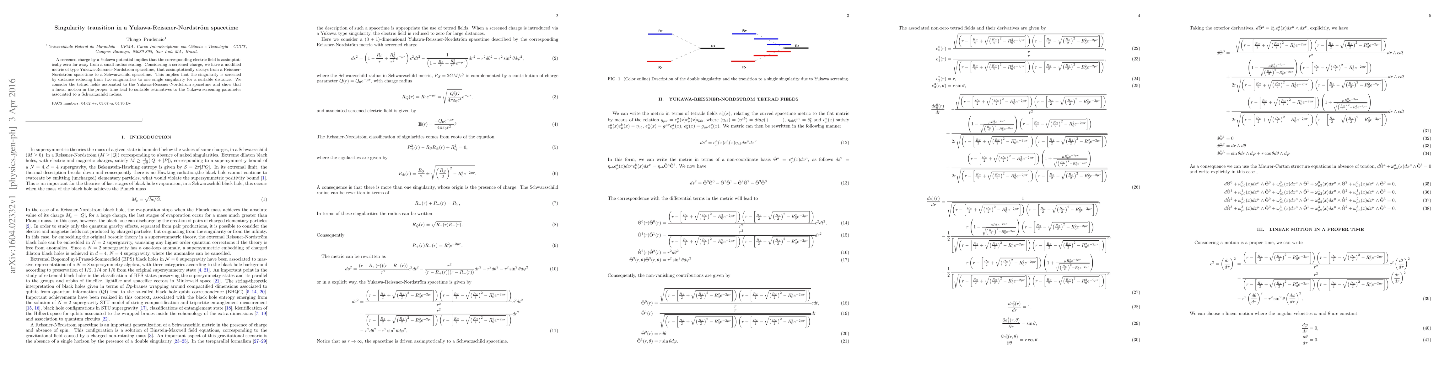 This paper investigates the singularity transition in Yukawa-Reissner-Nordström spacetime, where a Yukawa potential screens the charge, leading to a modified metric that transitions from a Reissner-Nordström to a Schwarzschild spacetime. The study shows that the singularity is reduced from two to one, with tetrad fields providing estimates for the Yukawa screening parameter.