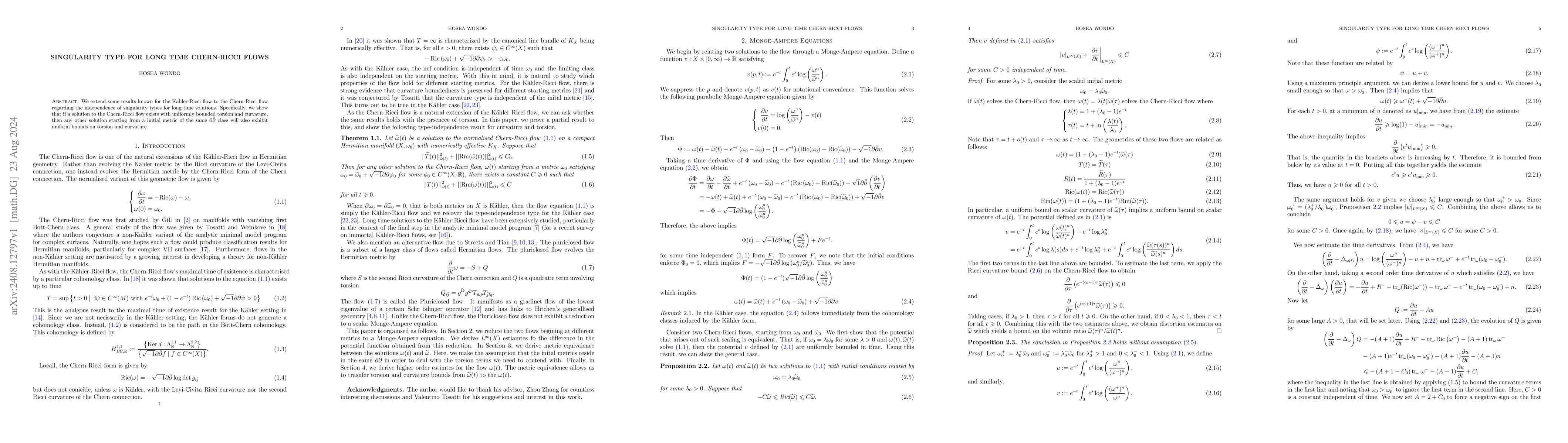 We extend some results known for the K\"ahler-Ricci flow to the Chern-Ricci flow regarding the independence of singularity types for long-time solutions. Specifically, we show that if a solution to the Chern-Ricci flow exists with uniformly bounded torsion and curvature, then any other solution starting from an initial metric of the same $\partial \bar{\partial}$ class will also exhibit uniform bounds on torsion and curvature.