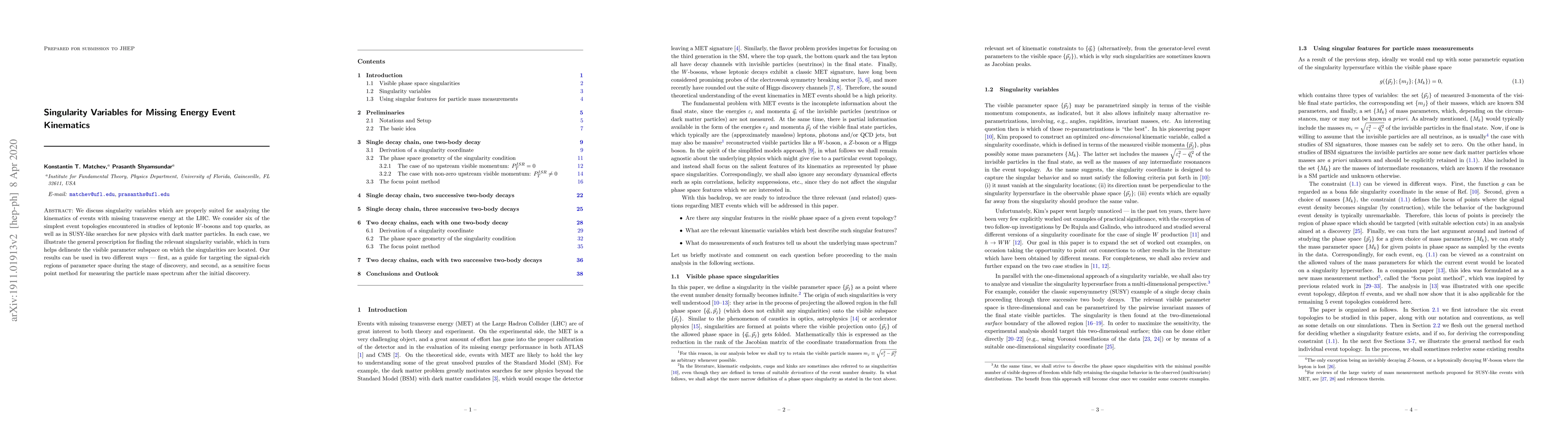 We discuss singularity variables which are properly suited for analyzing the kinematics of events with missing transverse energy at the LHC. We consider six of the simplest event topologies encountered in studies of leptonic W-bosons and top quarks, as well as in SUSY-like searches for new physics with dark matter particles. In each case, we illustrate the general prescription for finding the relevant singularity variable, which in turn helps delineate the visible parameter subspace on which the singularities are located. Our results can be used in two different ways - first, as a guide for targeting the signal-rich regions of parameter space during the stage of discovery, and second, as a sensitive focus point method for measuring the particle mass spectrum after the initial discovery.