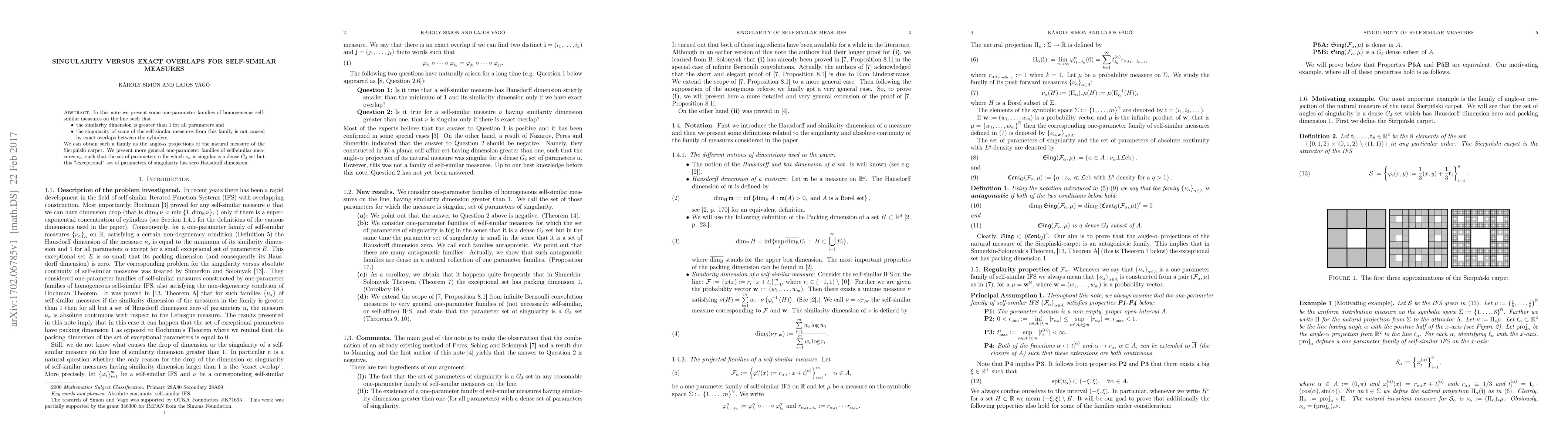 In this note we present some one-parameter families of homogeneous self-similar measures on the line such that - the similarity dimension is greater than $1$ for all parameters and - the singularity of some of the self-similar measures from this family is not caused by exact overlaps between the cylinders. We can obtain such a family as the angle-$\alpha$ projections of the natural measure of the Sierpi\'nski carpet. We present more general one-parameter families of self-similar measures $\nu_\alpha$, such that the set of parameters $\alpha$ for which $\nu_\alpha$ is singular is a dense $G_\delta$ set but this "exceptional" set of parameters of singularity has zero Hausdorff dimension.