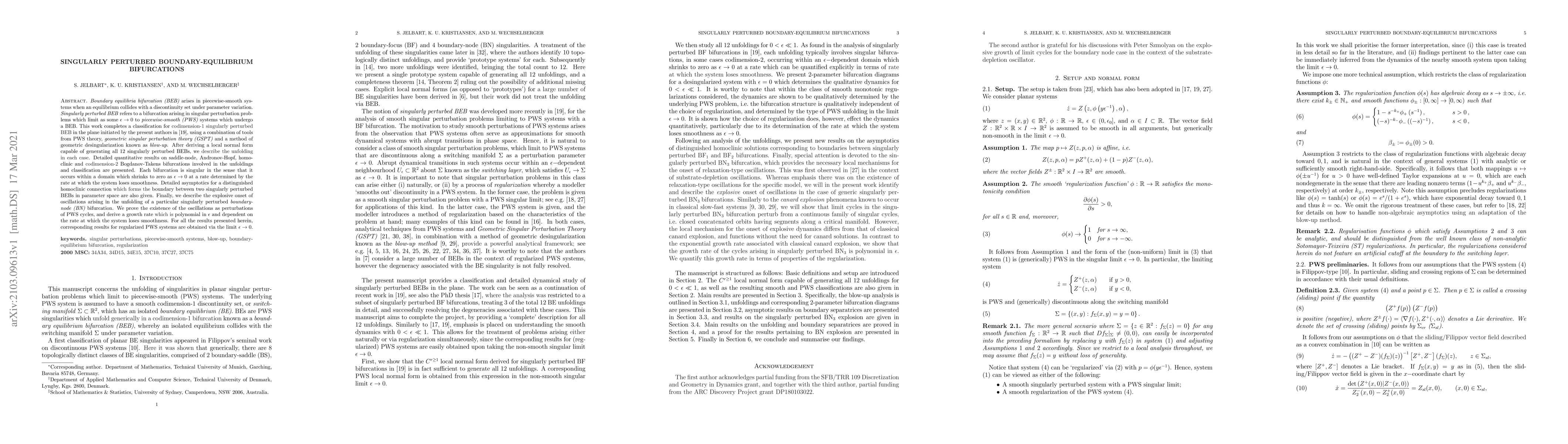 Boundary equilibria bifurcation (BEB) arises in piecewise-smooth systems when an equilibrium collides with a discontinuity set under parameter variation. Singularly perturbed BEB refers to a bifurcation arising in singular perturbation problems which limit as some $\epsilon \to 0$ to piecewise-smooth (PWS) systems which undergo a BEB. This work completes a classification for codimension-1 singularly perturbed BEB in the plane initiated by the present authors in [19], using a combination of tools from PWS theory, geometric singular perturbation theory (GSPT) and a method of geometric desingularization known as blow-up. After deriving a local normal form capable of generating all 12 singularly perturbed BEBs, we describe the unfolding in each case. Detailed quantitative results on saddle-node, Andronov-Hopf, homoclinic and codimension-2 Bogdanov-Takens bifurcations involved in the unfoldings and classification are presented. Each bifurcation is singular in the sense that it occurs within a domain which shrinks to zero as $\epsilon \to 0$ at a rate determined by the rate at which the system loses smoothness. Detailed asymptotics for a distinguished homoclinic connection which forms the boundary between two singularly perturbed BEBs in parameter space are also given. Finally, we describe the explosive onset of oscillations arising in the unfolding of a particular singularly perturbed boundary-node (BN) bifurcation. We prove the existence of the oscillations as perturbations of PWS cycles, and derive a growth rate which is polynomial in $\epsilon$ and dependent on the rate at which the system loses smoothness. For all the results presented herein, corresponding results for regularized PWS systems are obtained via the limit $\epsilon \to 0$.