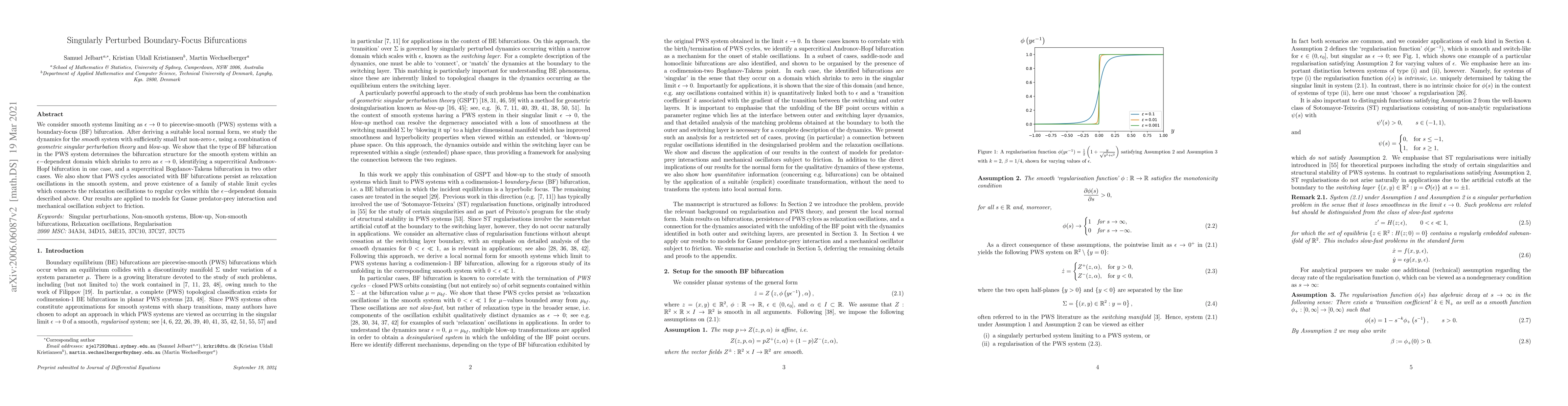 We consider smooth systems limiting as $\epsilon \to 0$ to piecewise-smooth (PWS) systems with a boundary-focus (BF) bifurcation. After deriving a suitable local normal form, we study the dynamics for the smooth system with $0 < \epsilon \ll 1$ using a combination of geometric singular perturbation theory and blow-up. We show that the type of BF bifurcation in the PWS system determines the bifurcation structure for the smooth system within an $\epsilon-$dependent domain which shrinks to zero as $\epsilon \to 0$, identifying a supercritical Andronov-Hopf bifurcation in one case, and a supercritical Bogdanov-Takens bifurcation in two other cases. We also show that PWS cycles associated with BF bifurcations persist as relaxation cycles in the smooth system, and prove existence of a family of stable limit cycles which connects the relaxation cycles to regular cycles within the $\epsilon-$dependent domain described above. Our results are applied to models for Gause predator-prey interaction and mechanical oscillation subject to friction.