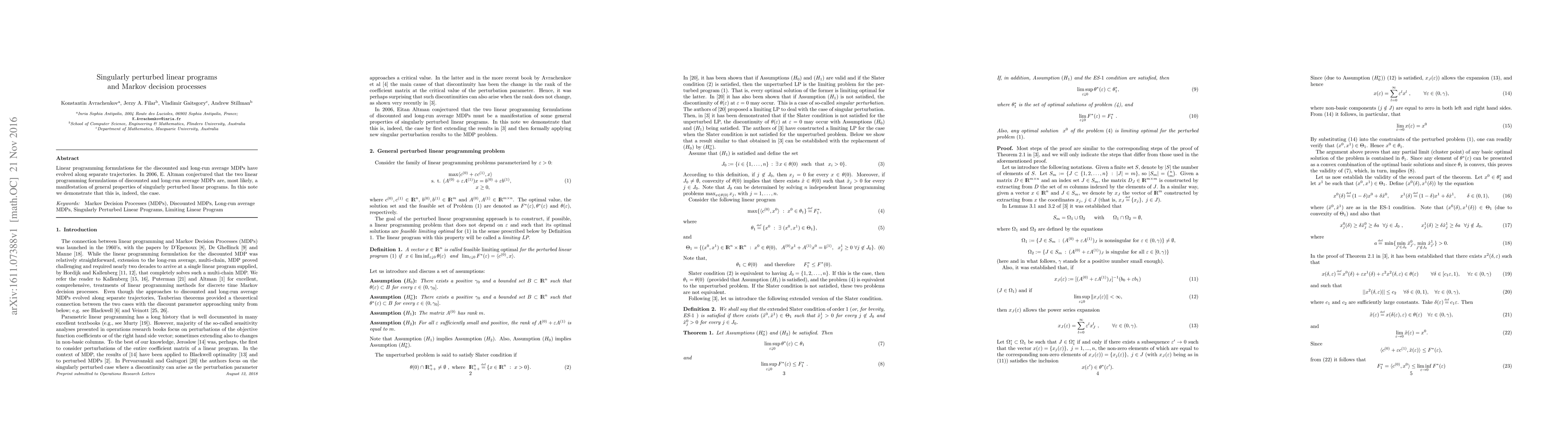 This paper proves that the linear programming formulations for discounted and long-run average Markov Decision Processes (MDPs) are indeed properties of singularly perturbed linear programs, as conjectured by E. Altman in 2006. The research establishes a connection between these MDP formulations and singular perturbation theory.