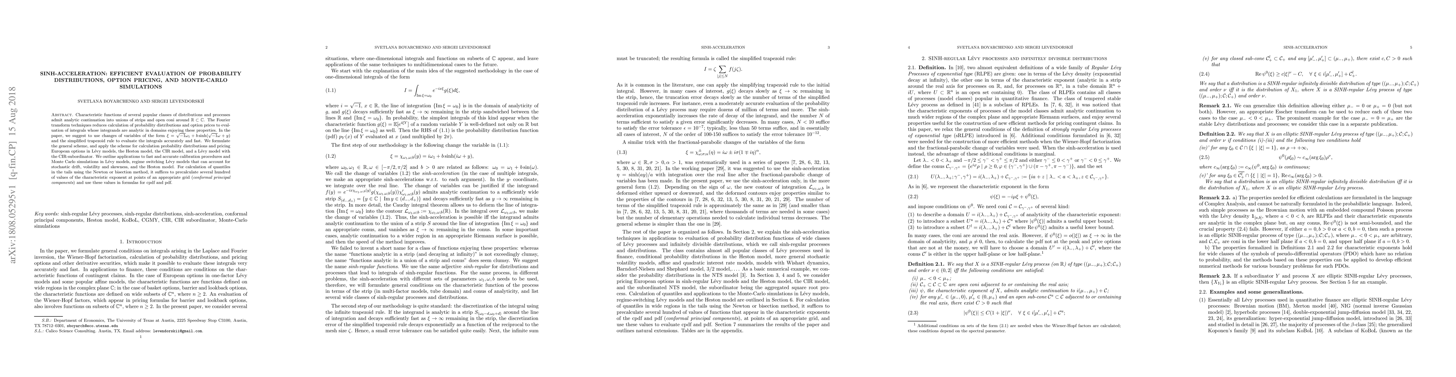 Characteristic functions of several popular classes of distributions and processes admit analytic continuation into unions of strips and open coni around $\mathbb{R}\subset \mathbb{C}$. The Fourier transform techniques reduces calculation of probability distributions and option prices to evaluation of integrals whose integrands are analytic in domains enjoying these properties. In the paper, we suggest to use changes of variables of the form $\xi=\sqrt{-1}\omega_1+b\sinh (\sqrt{-1}\omega+y)$ and the simplified trapezoid rule to evaluate the integrals accurately and fast. We formulate the general scheme, and apply the scheme for calculation probability distributions and pricing European options in L\'evy models, the Heston model, the CIR model, and a L\'evy model with the CIR-subordinator. We outline applications to fast and accurate calibration procedures and Monte Carlo simulations in L\'evy models, regime switching L\'evy models that can account for stochastic drift, volatility and skewness, and the Heston model. For calculation of quantiles in the tails using the Newton or bisection method, it suffices to precalculate several hundred of values of the characteristic exponent at points of an appropriate grid ({\em conformal principal components}) and use these values in formulas for cpdf and pdf.