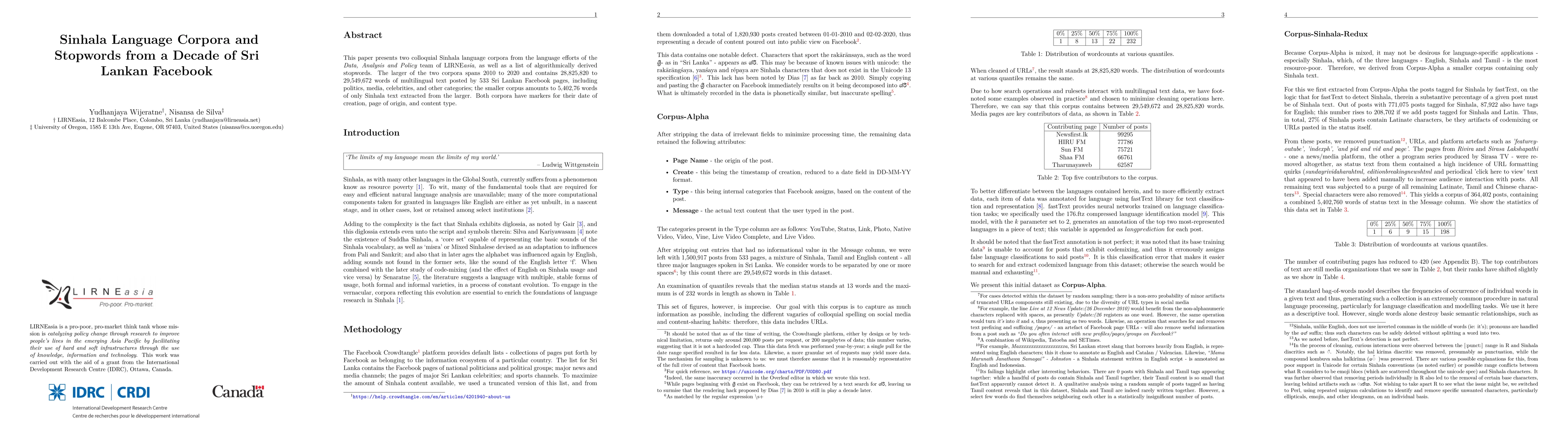 This paper introduces two Sinhala language corpora from Sri Lankan Facebook posts, one multilingual and one exclusively Sinhala, along with an algorithmically derived list of stopwords. The larger corpus spans 2010-2020 and includes diverse content, while the smaller Sinhala-only corpus totals around 5.4 million words.