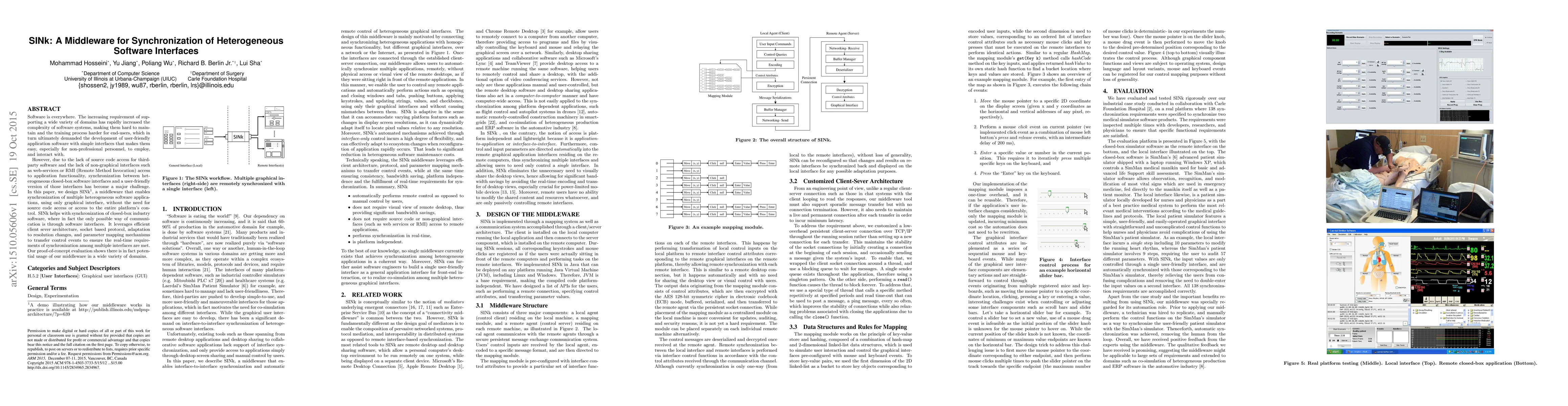 SINk is a middleware designed to synchronize heterogeneous software interfaces without requiring source code access. It facilitates real-time synchronization among closed-box software applications using only graphical interfaces, employing a client-server architecture, socket-based protocols, and parameter mapping mechanisms.