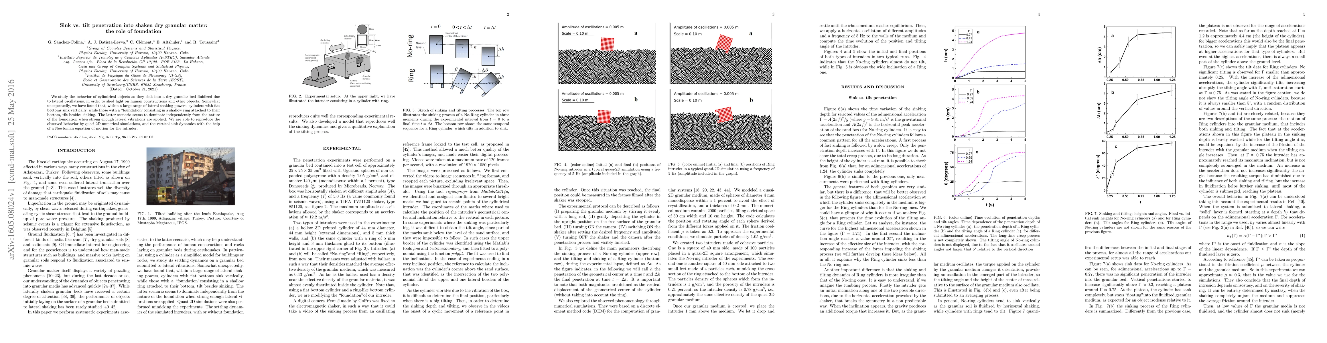 We study the behavior of cylindrical objects as they sink into a dry granular bed fluidized due to lateral oscillations, in order to shed light on human constructions and other objects. Somewhat unexpectedly, we have found that, within a large range of lateral shaking powers, cylinders with flat bottoms sink vertically, while those with a "foundation" consisting in a shallow ring attached to their bottom, tilt besides sinking. The latter scenario seems to dominate independently from the nature of the foundation when strong enough lateral vibrations are applied. We are able to reproduce the observed behavior by quasi-2D numerical simulations, and the vertical sink dynamics with the help of a Newtonian equation of motion for the intruder.