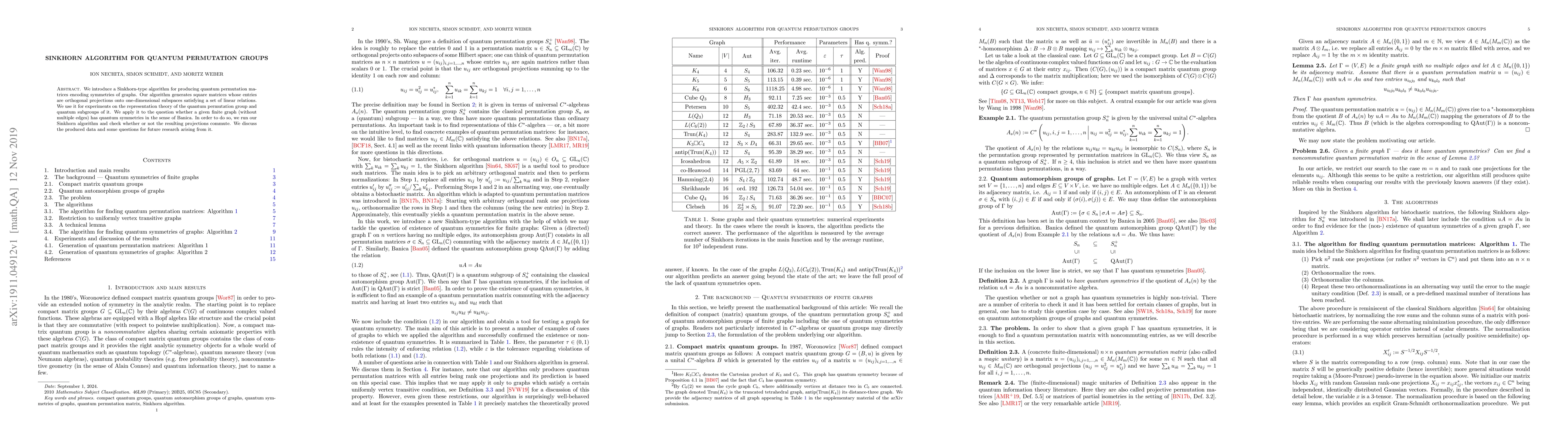 We introduce a Sinkhorn-type algorithm for producing quantum permutation matrices encoding symmetries of graphs. Our algorithm generates square matrices whose entries are orthogonal projections onto one-dimensional subspaces satisfying a set of linear relations. We use it for experiments on the representation theory of the quantum permutation group and quantum subgroups of it. We apply it to the question whether a given finite graph (without multiple edges) has quantum symmetries in the sense of Banica. In order to do so, we run our Sinkhorn algorithm and check whether or not the resulting projections commute. We discuss the produced data and some questions for future research arising from it.