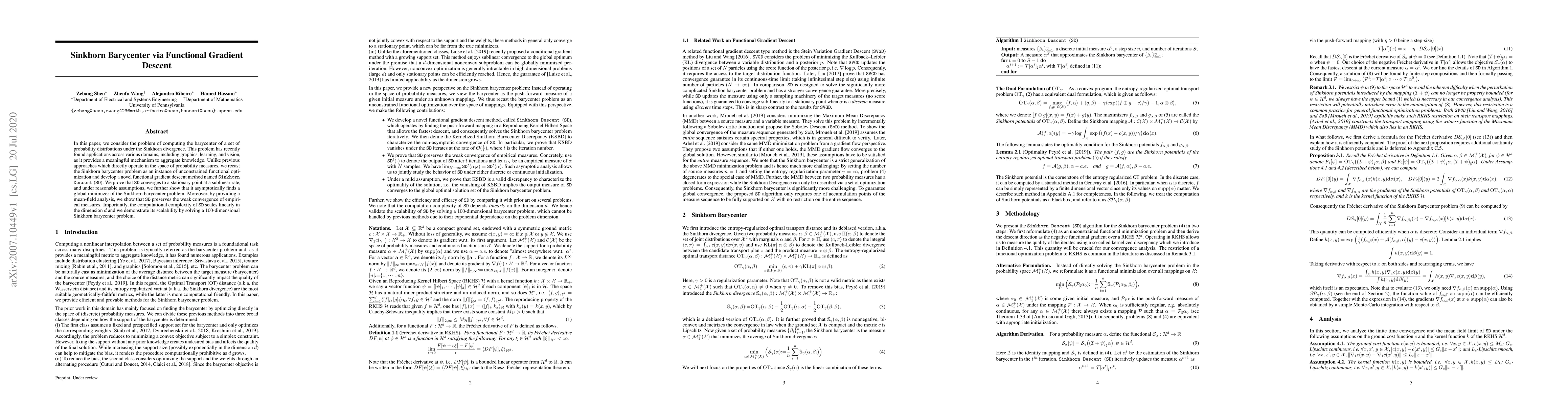This paper proposes a new functional gradient descent method called Sinkhorn Descent (SD) to compute the barycenter of probability distributions under the Sinkhorn divergence. SD converges to a stationary point at a sublinear rate and, under reasonable assumptions, finds a global minimizer, while maintaining linear computational complexity in dimension.