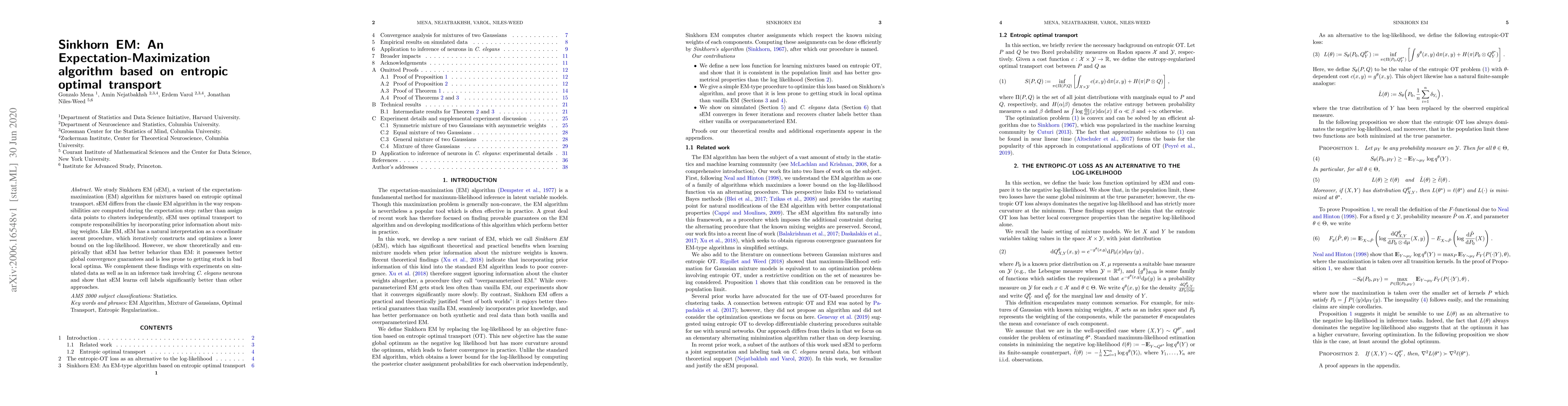 We study Sinkhorn EM (sEM), a variant of the expectation maximization (EM) algorithm for mixtures based on entropic optimal transport. sEM differs from the classic EM algorithm in the way responsibilities are computed during the expectation step: rather than assign data points to clusters independently, sEM uses optimal transport to compute responsibilities by incorporating prior information about mixing weights. Like EM, sEM has a natural interpretation as a coordinate ascent procedure, which iteratively constructs and optimizes a lower bound on the log-likelihood. However, we show theoretically and empirically that sEM has better behavior than EM: it possesses better global convergence guarantees and is less prone to getting stuck in bad local optima. We complement these findings with experiments on simulated data as well as in an inference task involving C. elegans neurons and show that sEM learns cell labels significantly better than other approaches.