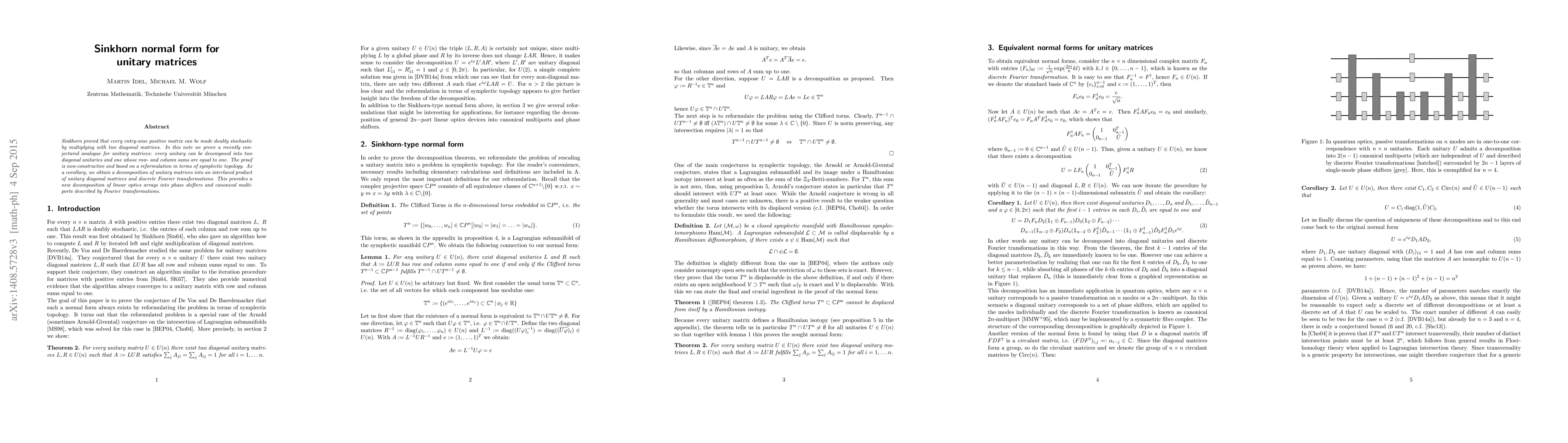 Title: Sinkhorn Normal Form for Unitary Matrices Summary: The paper proves a conjectured analogue of Sinkhorn's theorem for unitary matrices, showing they can be decomposed into two diagonal unitaries and one with equal row and column sums, using symplectic topology. This leads to a novel decomposition relevant for linear optics arrays.