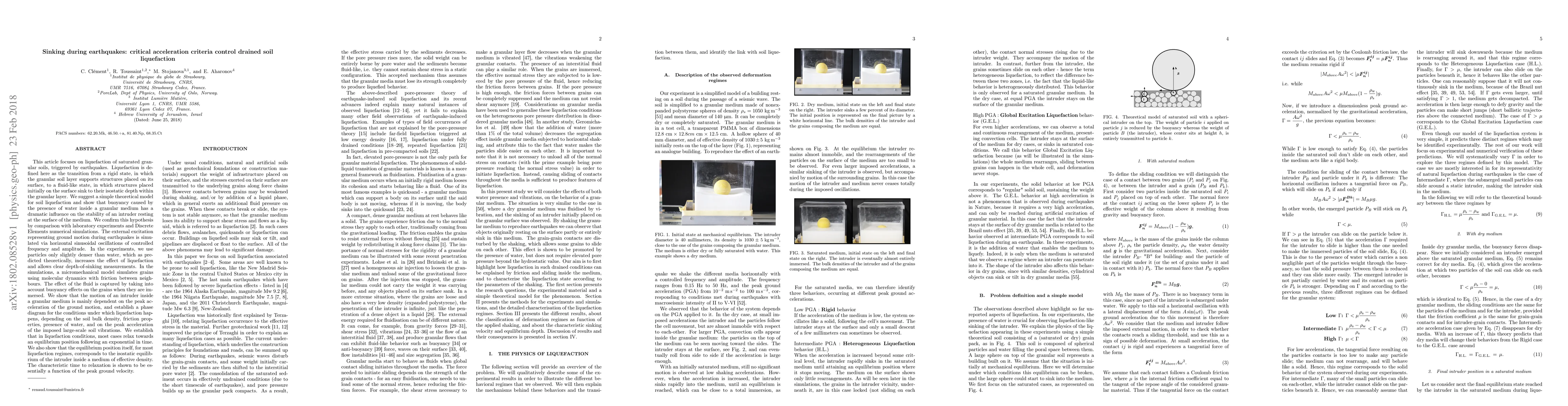 This article focuses on liquefaction of saturated granular soils, triggered by earthquakes. Liquefaction is definedhere as the transition from a rigid state, in which the granular soil layer supports structures placed on its surface, toa fluidlike state, in which structures placed initially on the surface sink to their isostatic depth within the granularlayer.We suggest a simple theoretical model for soil liquefaction and show that buoyancy caused by the presence ofwater inside a granular medium has a dramatic influence on the stability of an intruder resting at the surface of themedium.We confirm this hypothesis by comparison with laboratory experiments and discrete-element numericalsimulations. The external excitation representing ground motion during earthquakes is simulated via horizontalsinusoidal oscillations of controlled frequency and amplitude. In the experiments, we use particles only slightlydenser than water, which as predicted theoretically increases the effect of liquefaction and allows clear depth-of-sinkingmeasurements. In the simulations, a micromechanical model simulates grains using molecular dynamicswith friction between neighbors. The effect of the fluid is captured by taking into account buoyancy effects onthe grains when they are immersed. We show that the motion of an intruder inside a granular medium is mainlydependent on the peak acceleration of the ground motion and establish a phase diagram for the conditions underwhich liquefaction happens, depending on the soil bulk density, friction properties, presence of water, and peak acceleration of the imposed large-scale soil vibrations.We establish that in liquefaction conditions, most cases relaxtoward an equilibrium position following an exponential in time.We also show that the equilibrium position itself,for most liquefaction regimes, corresponds to the isostatic equilibrium of the intruder inside a medium of effectivedensity. The characteristic time to relaxation is shown to be essentially a function of the peak ground velocity.