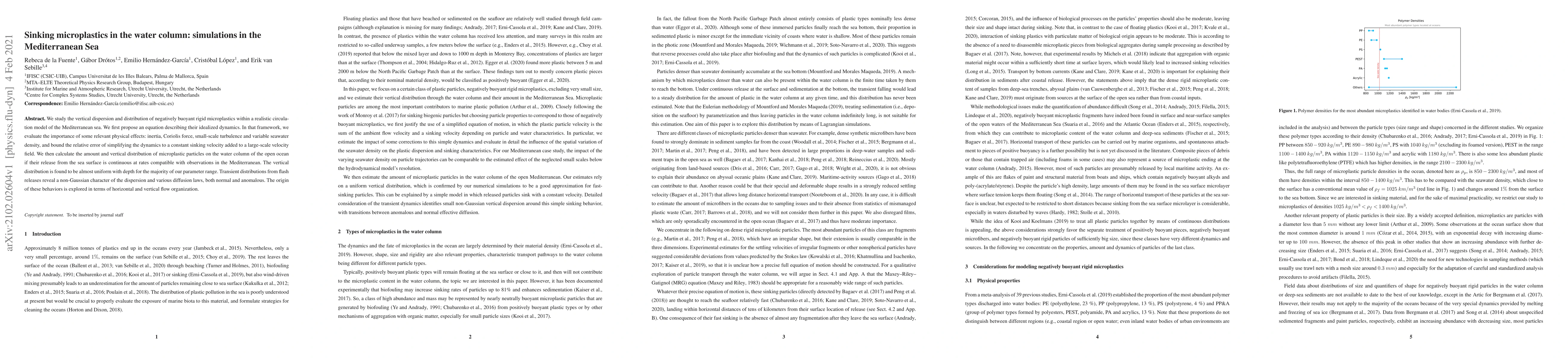 We study the vertical dispersion and distribution of negatively buoyant rigid microplastics within a realistic circulation model of the Mediterranean sea. We first propose an equation describing their idealized dynamics. In that framework, we evaluate the importance of some relevant physical effects: inertia, Coriolis force, small-scale turbulence and variable seawater density, and bound the relative error of simplifying the dynamics to a constant sinking velocity added to a large-scale velocity field. We then calculate the amount and vertical distribution of microplastic particles on the water column of the open ocean if their release from the sea surface is continuous at rates compatible with observations in the Mediterranean. The vertical distribution is found to be almost uniform with depth for the majority of our parameter range. Transient distributions from flash releases reveal a non-Gaussian character of the dispersion and various diffusion laws, both normal and anomalous. The origin of these behaviors is explored in terms of horizontal and vertical flow organization.