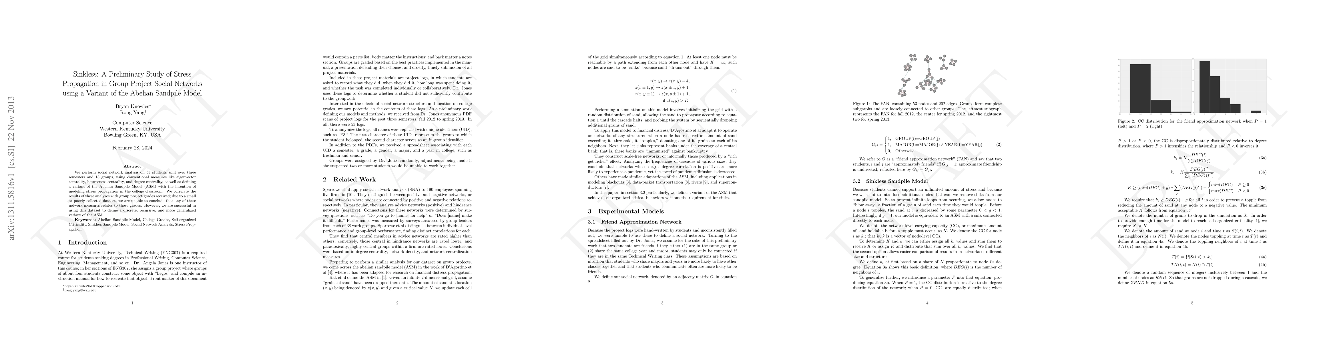 We perform social network analysis on 53 students split over three semesters and 13 groups, using conventional measures like eigenvector centrality, betweeness centrality, and degree centrality, as well as defining a variant of the Abelian Sandpile Model (ASM) with the intention of modeling stress propagation in the college classroom. We correlate the results of these analyses with group project grades received; due to a small or poorly collected dataset, we are unable to conclude that any of these network measures relates to those grades. However, we are successful in using this dataset to define a discrete, recursive, and more generalized variant of the ASM. Abelian Sandpile Model, College Grades, Self-organized Criticality, Sinkless Sandpile Model, Social Network Analysis, Stress Propagation