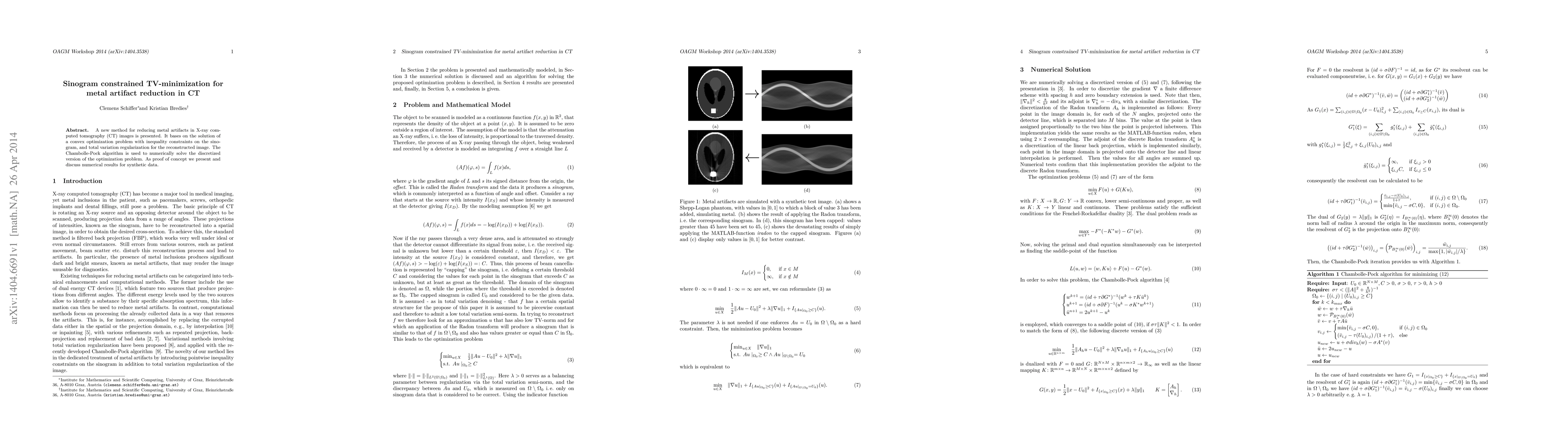 This paper introduces a novel method for reducing metal artifacts in CT images using sinogram constraints and total variation regularization, solved via the Chambolle-Pock algorithm, demonstrating effectiveness through synthetic data analysis.