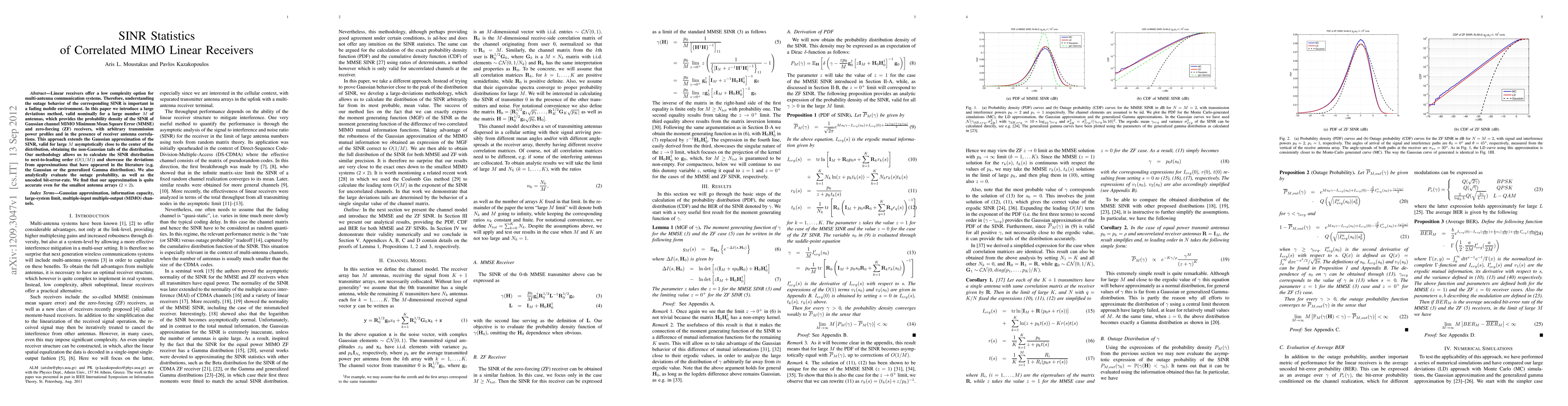 Linear receivers offer a low complexity option for multi-antenna communication systems. Therefore, understanding the outage behavior of the corresponding SINR is important in a fading mobile environment. In this paper we introduce a large deviations method, valid nominally for a large number M of antennas, which provides the probability density of the SINR of Gaussian channel MIMO Minimum Mean Square Error (MMSE) and zero-forcing (ZF) receivers, with arbitrary transmission power profiles and in the presence of receiver antenna correlations. This approach extends the Gaussian approximation of the SINR, valid for large M asymptotically close to the center of the distribution, obtaining the non-Gaussian tails of the distribution. Our methodology allows us to calculate the SINR distribution to next-to-leading order (O(1/M)) and showcase the deviations from approximations that have appeared in the literature (e.g. the Gaussian or the generalized Gamma distribution). We also analytically evaluate the outage probability, as well as the uncoded bit-error-rate. We find that our approximation is quite accurate even for the smallest antenna arrays (2x2).