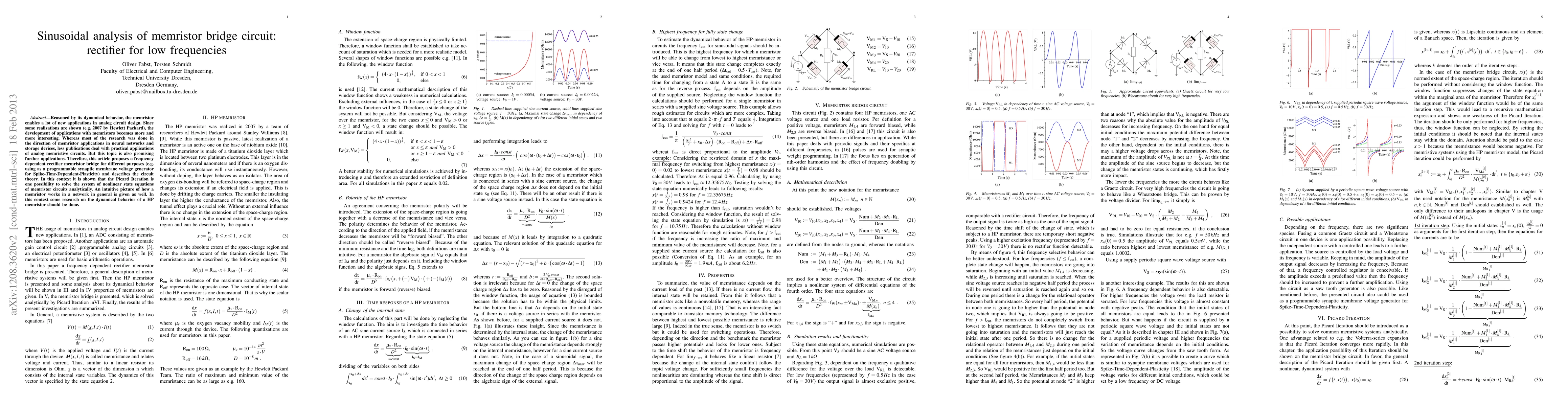 This paper explores the sinusoidal analysis of memristor bridge circuits for low-frequency applications, proposing a novel rectifier memristor bridge for potential uses in neural networks and analog circuits. It discusses the analytical solution of the circuit's nonlinear state equations using Picard Iteration and provides insights into the memristor's dynamical behavior.