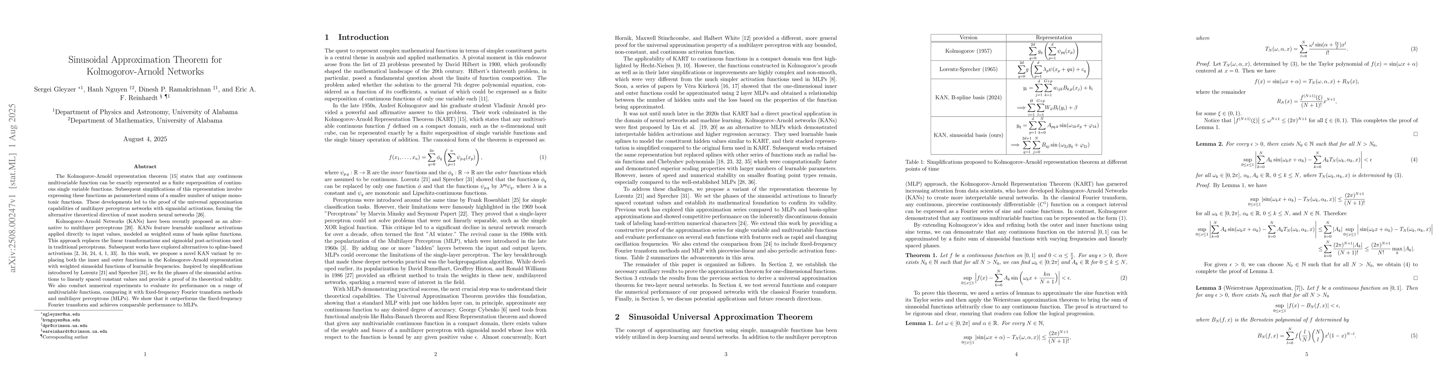 The Kolmogorov-Arnold representation theorem states that any continuous multivariable function can be exactly represented as a finite superposition of continuous single variable functions. Subsequent simplifications of this representation involve expressing these functions as parameterized sums of a smaller number of unique monotonic functions. These developments led to the proof of the universal approximation capabilities of multilayer perceptron networks with sigmoidal activations, forming the alternative theoretical direction of most modern neural networks. Kolmogorov-Arnold Networks (KANs) have been recently proposed as an alternative to multilayer perceptrons. KANs feature learnable nonlinear activations applied directly to input values, modeled as weighted sums of basis spline functions. This approach replaces the linear transformations and sigmoidal post-activations used in traditional perceptrons. Subsequent works have explored alternatives to spline-based activations. In this work, we propose a novel KAN variant by replacing both the inner and outer functions in the Kolmogorov-Arnold representation with weighted sinusoidal functions of learnable frequencies. Inspired by simplifications introduced by Lorentz and Sprecher, we fix the phases of the sinusoidal activations to linearly spaced constant values and provide a proof of its theoretical validity. We also conduct numerical experiments to evaluate its performance on a range of multivariable functions, comparing it with fixed-frequency Fourier transform methods and multilayer perceptrons (MLPs). We show that it outperforms the fixed-frequency Fourier transform and achieves comparable performance to MLPs.