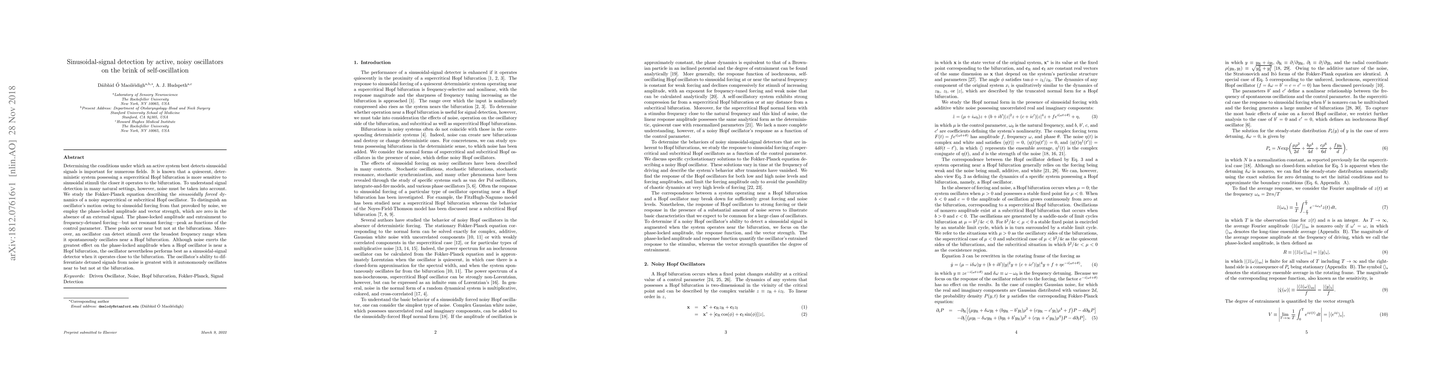 Determining the conditions under which an active system best detects sinusoidal signals is important for numerous fields. It is known that a quiescent, deterministic system possessing a supercritical Hopf bifurcation is more sensitive to sinusoidal stimuli the closer it operates to the bifurcation. To understand signal detection in many natural settings, however, noise must be taken into account. We study the Fokker-Planck equation describing the sinusoidally forced dynamics of a noisy supercritical or subcritical Hopf oscillator. To distinguish an oscillator's motion owing to sinusoidal forcing from that provoked by noise, we employ the phase-locked amplitude and vector strength, which are zero in the absence of an external signal. The phase-locked amplitude and entrainment to frequency-detuned forcing but not resonant forcing peak as functions of the control parameter. These peaks occur near but not at the bifurcations. Moreover, an oscillator can detect stimuli over the broadest frequency range when it spontaneously oscillates near a Hopf bifurcation. Although noise exerts the greatest effect on the phase-locked amplitude when a Hopf oscillator is near a Hopf bifurcation, the oscillator nevertheless performs best as a sinusoidal-signal detector when it operates close to the bifurcation. The oscillator's ability to differentiate detuned signals from noise is greatest with it autonomously oscillates near to but not at the bifurcation.