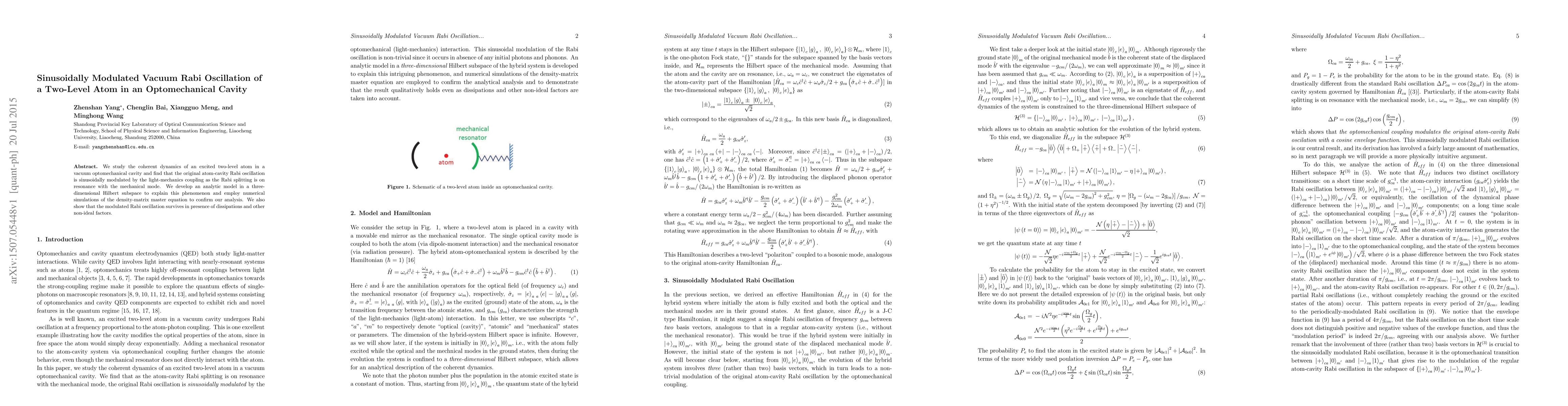 This paper investigates the coherent dynamics of a two-level atom in an optomechanical cavity, revealing that the vacuum Rabi oscillation is sinusoidally modulated by light-mechanics coupling when the Rabi splitting resonates with the mechanical mode. The authors develop an analytic model and confirm their findings using numerical simulations, demonstrating the robustness of the modulated Rabi oscillation against dissipations and non-ideal factors.