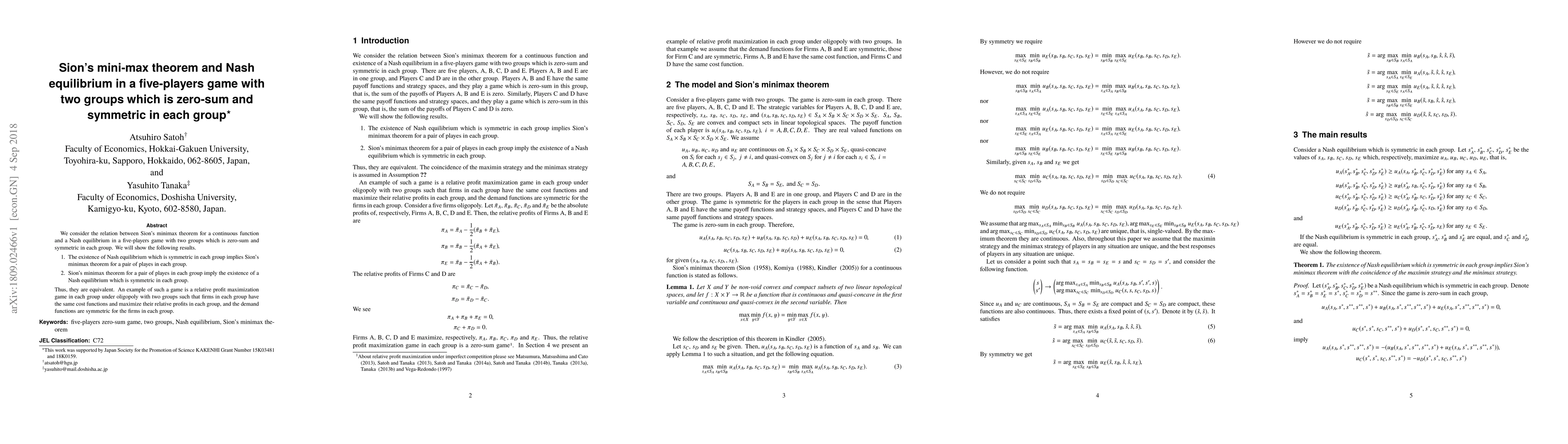 This paper explores the equivalence between Sion's minimax theorem and Nash equilibrium in a five-player game with two symmetric, zero-sum groups. It demonstrates that the existence of a symmetric Nash equilibrium implies Sion's minimax theorem for each group, and vice versa.