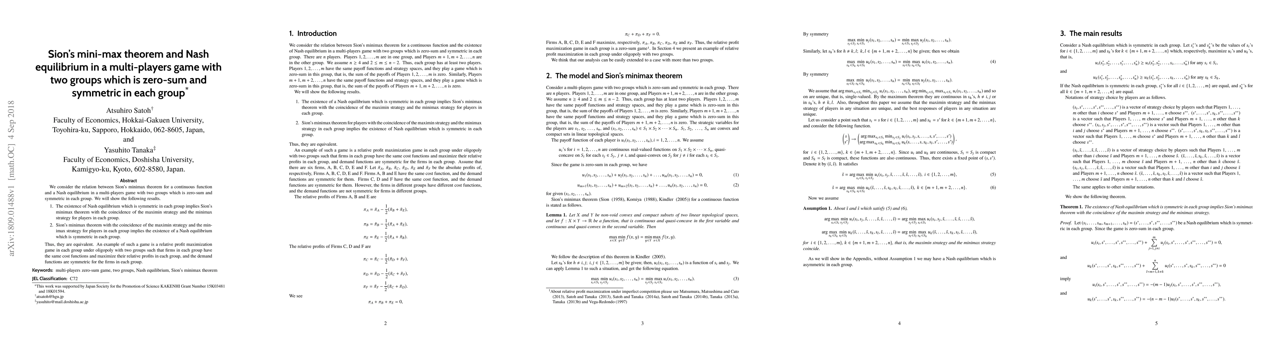 This paper explores the equivalence between Sion's minimax theorem and Nash equilibrium in a zero-sum, symmetric multi-player game with two groups. It demonstrates that the existence of a symmetric Nash equilibrium implies Sion's minimax theorem, and vice versa, establishing their equivalence.