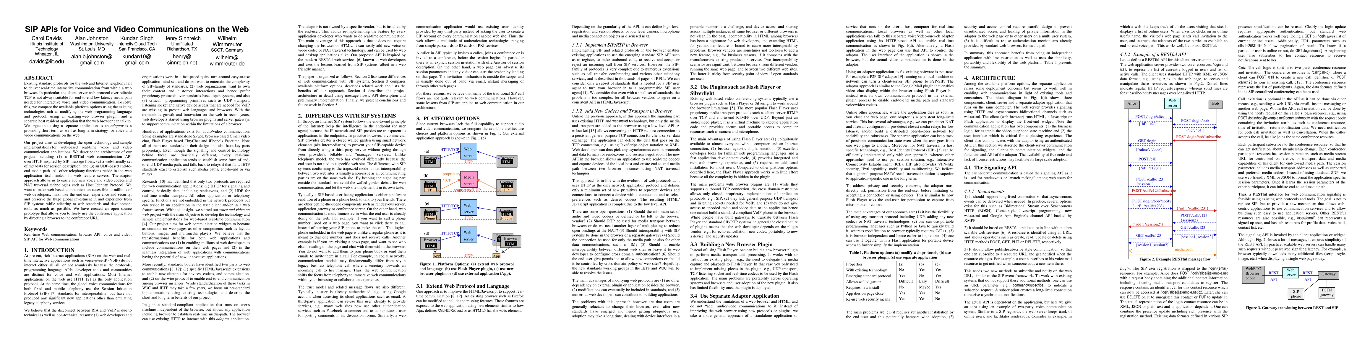 Existing standard protocols for the web and Internet telephony fail to deliver real-time interactive communication from within a web browser. In particular, the client-server web protocol over reliable TCP is not always suitable for end-to-end low latency media path needed for interactive voice and video communication. To solve this, we compare the available platform options using the existing technologies such as modifying the web programming language and protocol, using an existing web browser plugin, and a separate host resident application that the web browser can talk to. We argue that using a separate application as an adaptor is a promising short term as well as long-term strategy for voice and video communications on the web. Our project aims at developing the open technology and sample implementations for web-based real-time voice and video communication applications. We describe the architecture of our project including (1) a RESTful web communication API over HTTP inspired by SIP message flows, (2) a web-friendly set of metadata for session description, and (3) an UDP-based end-to-end media path. All other telephony functions reside in the web application itself and/or in web feature servers. The adaptor approach allows us to easily add new voice and video codecs and NAT traversal technologies such as Host Identity Protocol. We want to make web-based communication accessible to millions of web developers, maximize the end user experience and security, and preserve the huge global investment in and experience from SIP systems while adhering to web standards and development tools as much as possible. We have created an open source prototype that allows you to freely use the conference application by directing a browser to the conference URL.