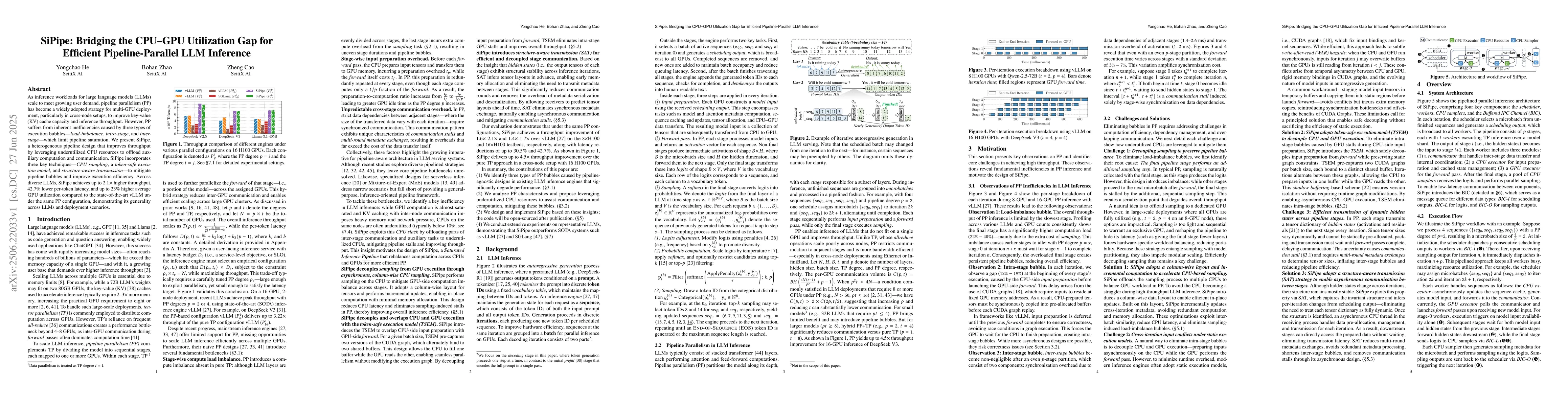 As inference workloads for large language models (LLMs) scale to meet growing user demand, pipeline parallelism (PP) has become a widely adopted strategy for multi-GPU deployment, particularly in cross-node setups, to improve key-value (KV) cache capacity and inference throughput. However, PP suffers from inherent inefficiencies caused by three types of execution bubbles-load-imbalance, intra-stage, and inter-stage-which limit pipeline saturation. We present SiPipe, a heterogeneous pipeline design that improves throughput by leveraging underutilized CPU resources to offload auxiliary computation and communication. SiPipe incorporates three key techniques-CPU sampling, a token-safe execution model, and structure-aware transmission-to mitigate pipeline bubbles and improve execution efficiency. Across diverse LLMs, SiPipe achieves up to 2.1 times higher throughput, 43% lower per-token latency, and up to 23% higher average GPU utilization compared to the state-of-the-art vLLM under the same PP configuration, demonstrating its generality across LLMs and deployment scenarios.
