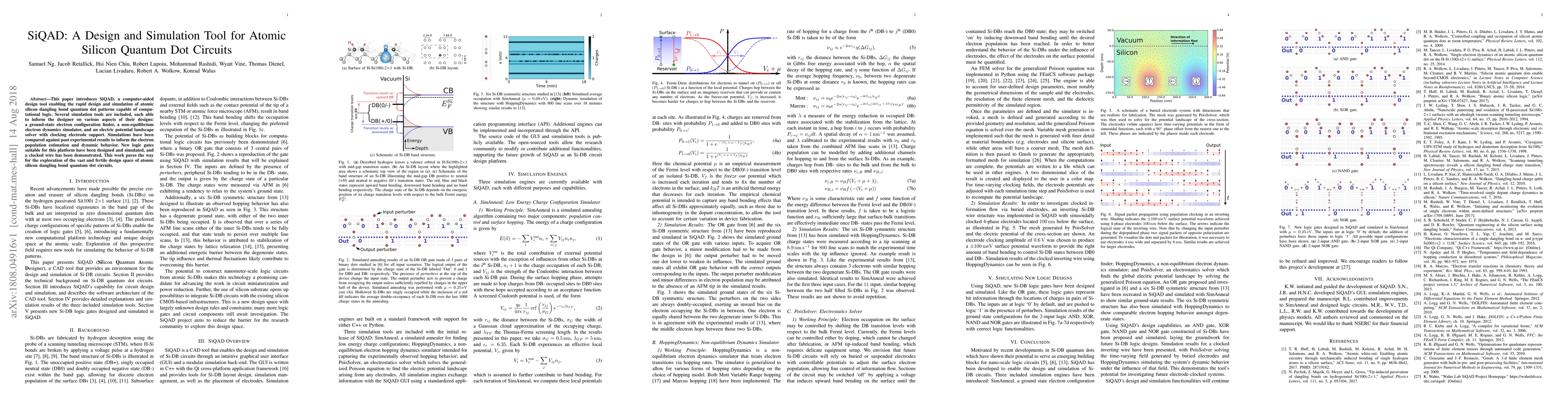 SiQAD is a computer-aided design tool for simulating atomic silicon quantum dot circuits, featuring tools for electron configuration, dynamics, and electric potential landscape analysis. The tool has been validated against experimental results and demonstrates new logic gates and a clocked wire.