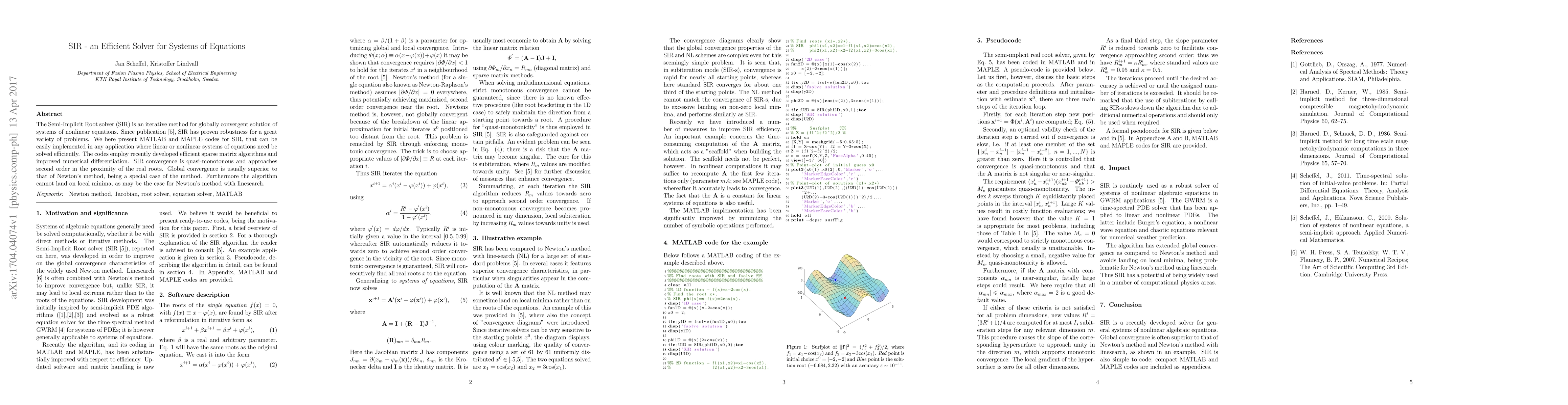 The Semi-Implicit Root solver (SIR) is an iterative method for globally convergent solution of systems of nonlinear equations. Since publication, SIR has proven robustness for a great variety of problems. We here present MATLAB and MAPLE codes for SIR, that can be easily implemented in any application where linear or nonlinear systems of equations need be solved efficiently. The codes employ recently developed efficient sparse matrix algorithms and improved numerical differentiation. SIR convergence is quasi-monotonous and approaches second order in the proximity of the real roots. Global convergence is usually superior to that of Newtons method, being a special case of the method. Furthermore the algorithm cannot land on local minima, as may be the case for Newtons method with linesearch.