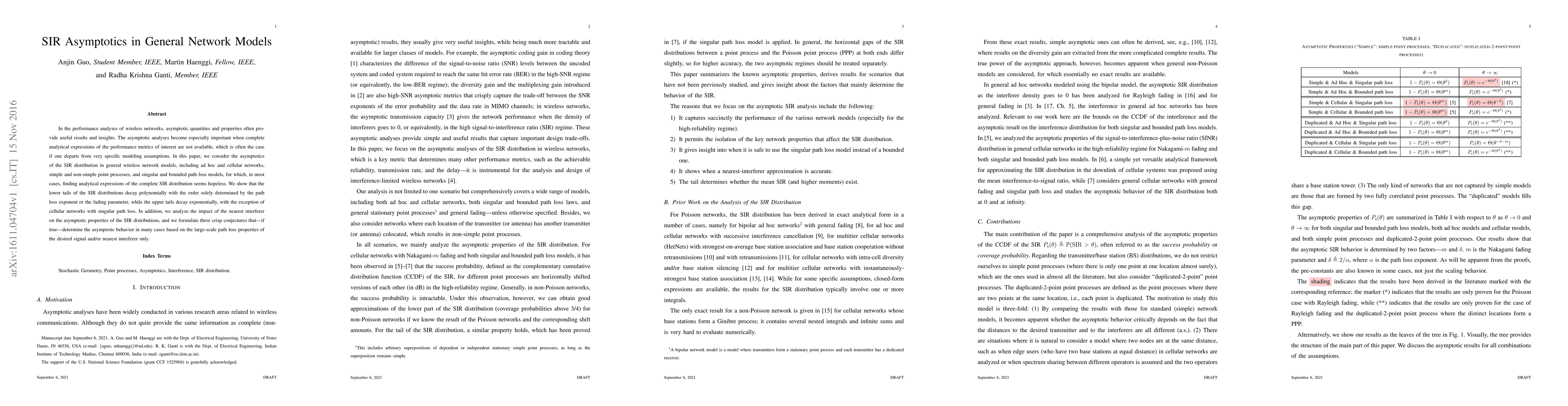 In the performance analyses of wireless networks, asymptotic quantities and properties often pro- vide useful results and insights. The asymptotic analyses become especially important when complete analytical expressions of the performance metrics of interest are not available, which is often the case if one departs from very specific modeling assumptions. In this paper, we consider the asymptotics of the SIR distribution in general wireless network models, including ad hoc and cellular networks, simple and non-simple point processes, and singular and bounded path loss models, for which, in most cases, finding analytical expressions of the complete SIR distribution seems hopeless. We show that the lower tails of the SIR distributions decay polynomially with the order solely determined by the path loss exponent or the fading parameter, while the upper tails decay exponentially, with the exception of cellular networks with singular path loss. In addition, we analyze the impact of the nearest interferer on the asymptotic properties of the SIR distributions, and we formulate three crisp conjectures that -if true- determine the asymptotic behavior in many cases based on the large-scale path loss properties of the desired signal and/or nearest interferer only.