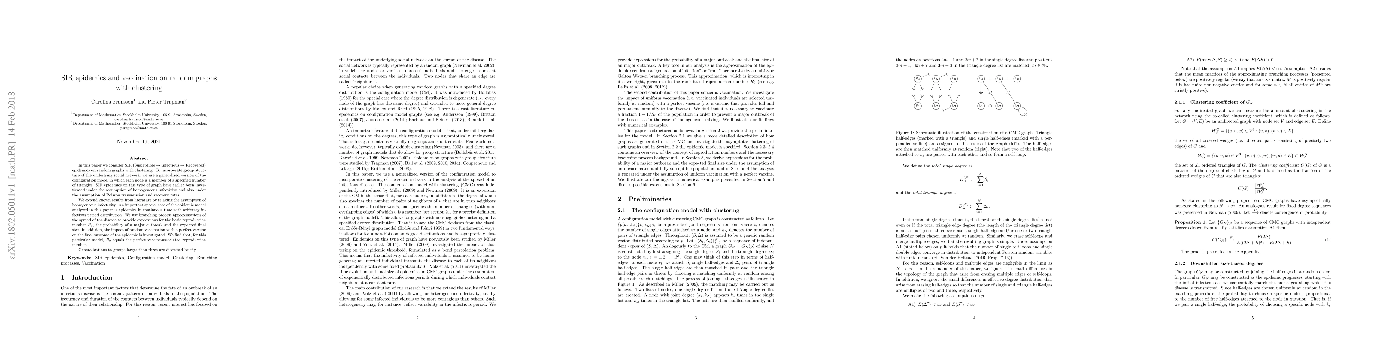 This paper studies SIR epidemics on random graphs with clustering, using a generalized configuration model to incorporate social network group structures. It extends previous results by relaxing the assumption of homogeneous infectivity and analyzes the impact of random vaccination on epidemic outcomes.