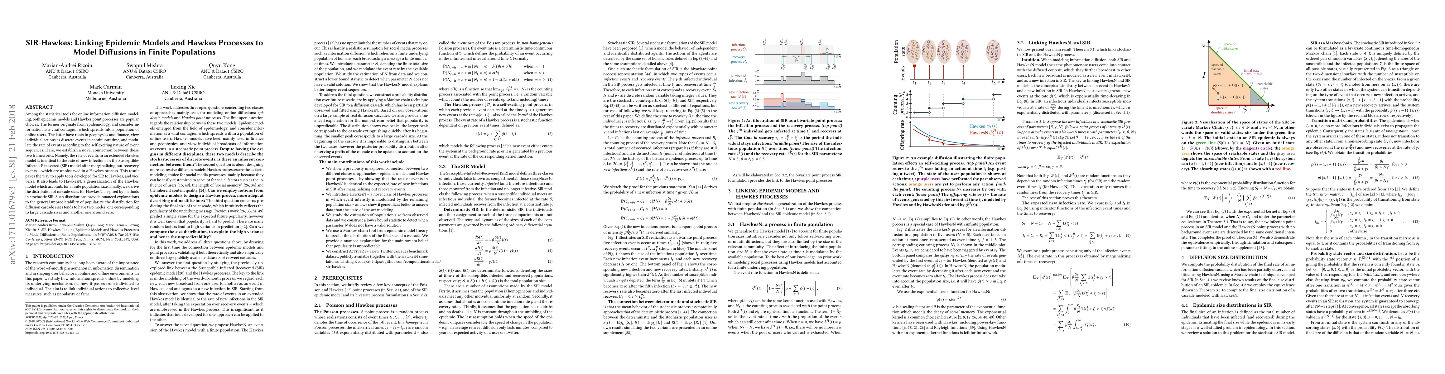 Among the statistical tools for online information diffusion modeling, both epidemic models and Hawkes point processes are popular choices. The former originate from epidemiology, and consider information as a viral contagion which spreads into a population of online users. The latter have roots in geophysics and finance, view individual actions as discrete events in continuous time, and modulate the rate of events according to the self-exciting nature of event sequences. Here, we establish a novel connection between these two frameworks. Namely, the rate of events in an extended Hawkes model is identical to the rate of new infections in the Susceptible-Infected-Recovered (SIR) model after marginalizing out recovery events -- which are unobserved in a Hawkes process. This result paves the way to apply tools developed for SIR to Hawkes, and vice versa. It also leads to HawkesN, a generalization of the Hawkes model which accounts for a finite population size. Finally, we derive the distribution of cascade sizes for HawkesN, inspired by methods in stochastic SIR. Such distributions provide nuanced explanations to the general unpredictability of popularity: the distribution for diffusion cascade sizes tends to have two modes, one corresponding to large cascade sizes and another one around zero.