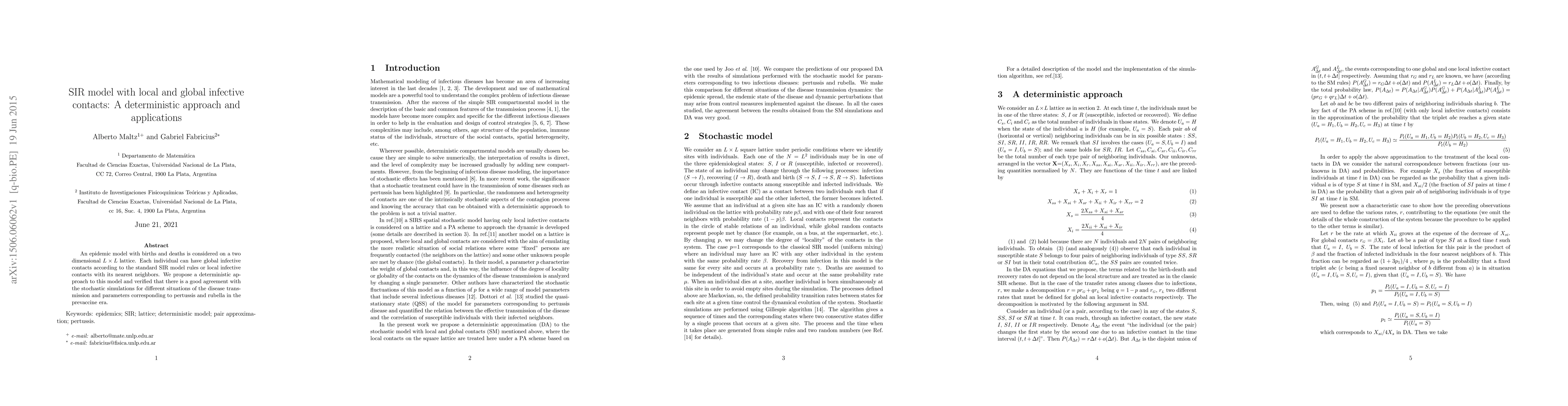 This paper proposes a deterministic SIR model for an epidemic on a lattice, allowing both global and local infective contacts. The model's accuracy is validated through comparison with stochastic simulations, demonstrating its applicability to pertussis and rubella transmission in the prevaccine era.